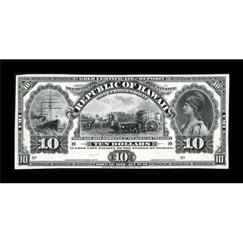 <B>Hawaii</B></I> Republic of Hawaii $10 1895 Pick 7p.<BR> The embossing is very pronounced on this once folded face proof that exhibits a few pinholes. Quite elusive as such and sure to generate plenty of bidder interest. <B>Choice About Uncirculated</B></I>.<BR><BR><B>Coin Engraver:</B> probably Joseph Wright<BR><BR><b>Shipping:</b> Coins & Currency (<a target="_blank" href="http://www.heritageauctions.com/common/shipping.php">view shipping information</a>)