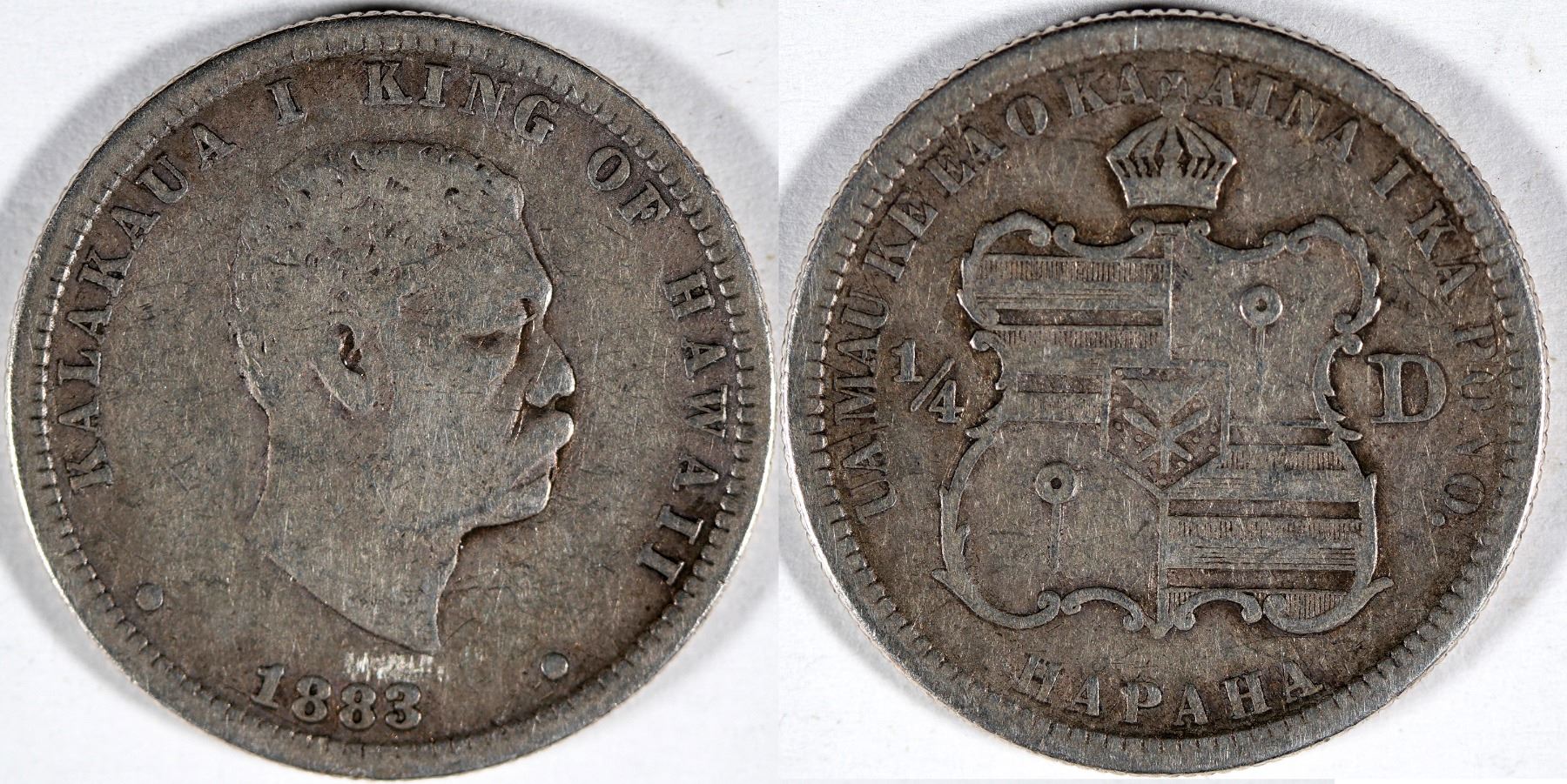 Twenty-five cent coin dated 1883 from the Kingdom of Hawaii bearing an image of King Kalakaua I on the obverse and the coat of arms on the reverse. Circulated but good condition.