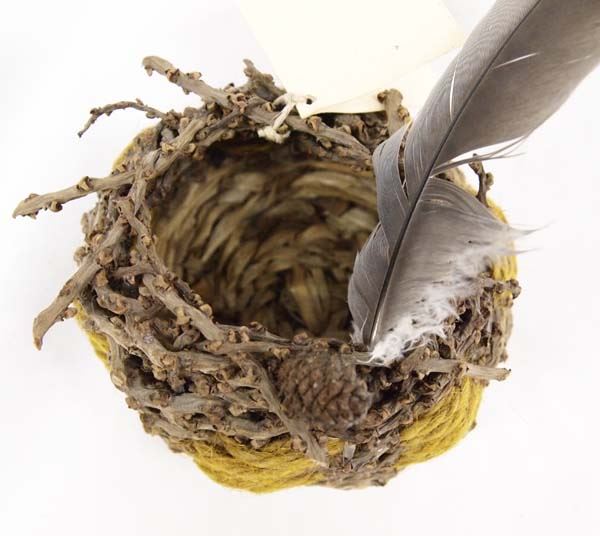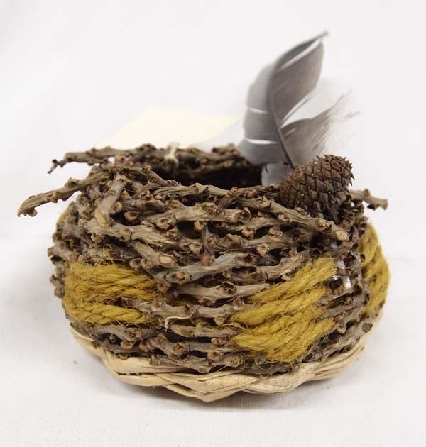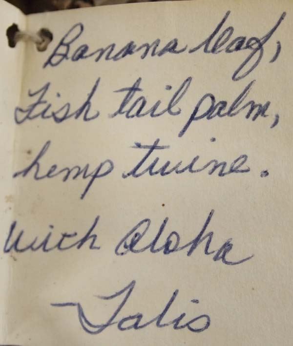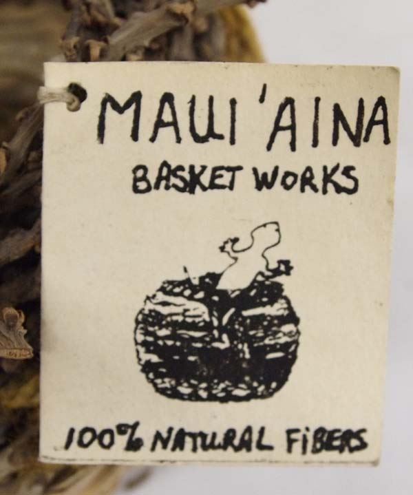 Hawaiian Basket from the MAUI'AINA Basket Works. This sweet little basket is woven of Banana Leaf, Fish Tail Palm and Hemp Twine. It measures approx. 3'' x 4.5''.