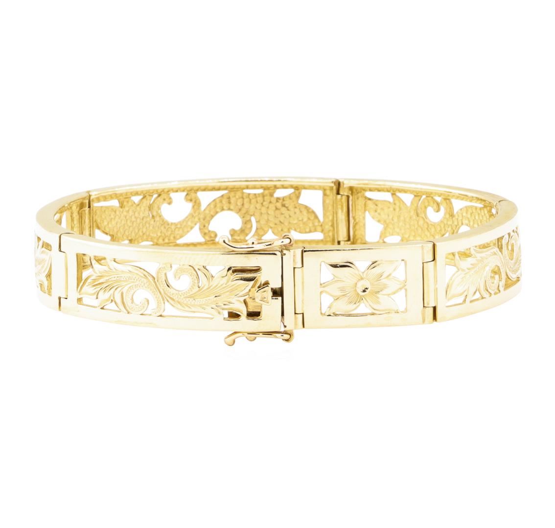 One Hawaiian heirloom bracelet measuring approximately seven and a half inches in length and 11mm in width featuring: 14KT yellow gold weighing 30.3 grams.