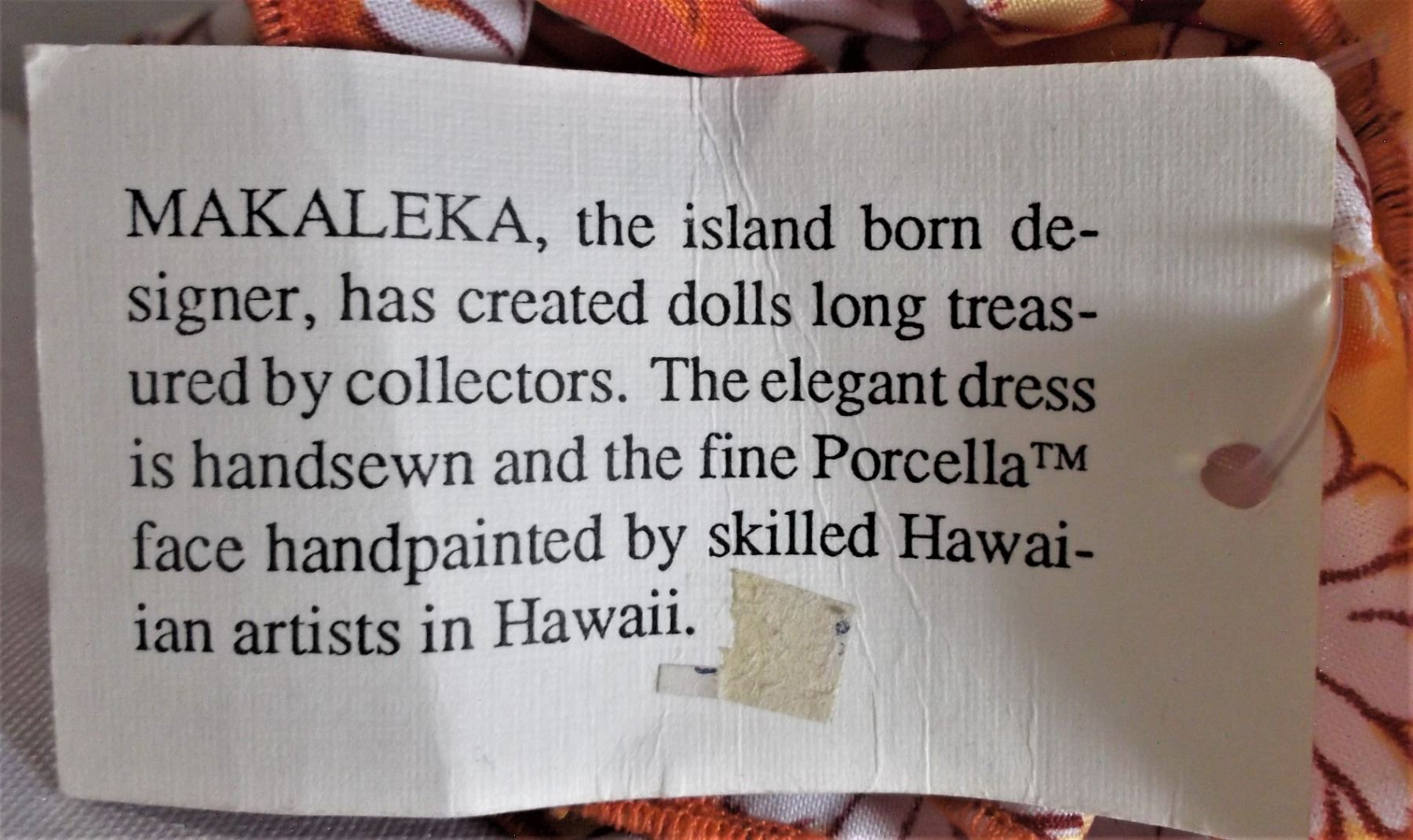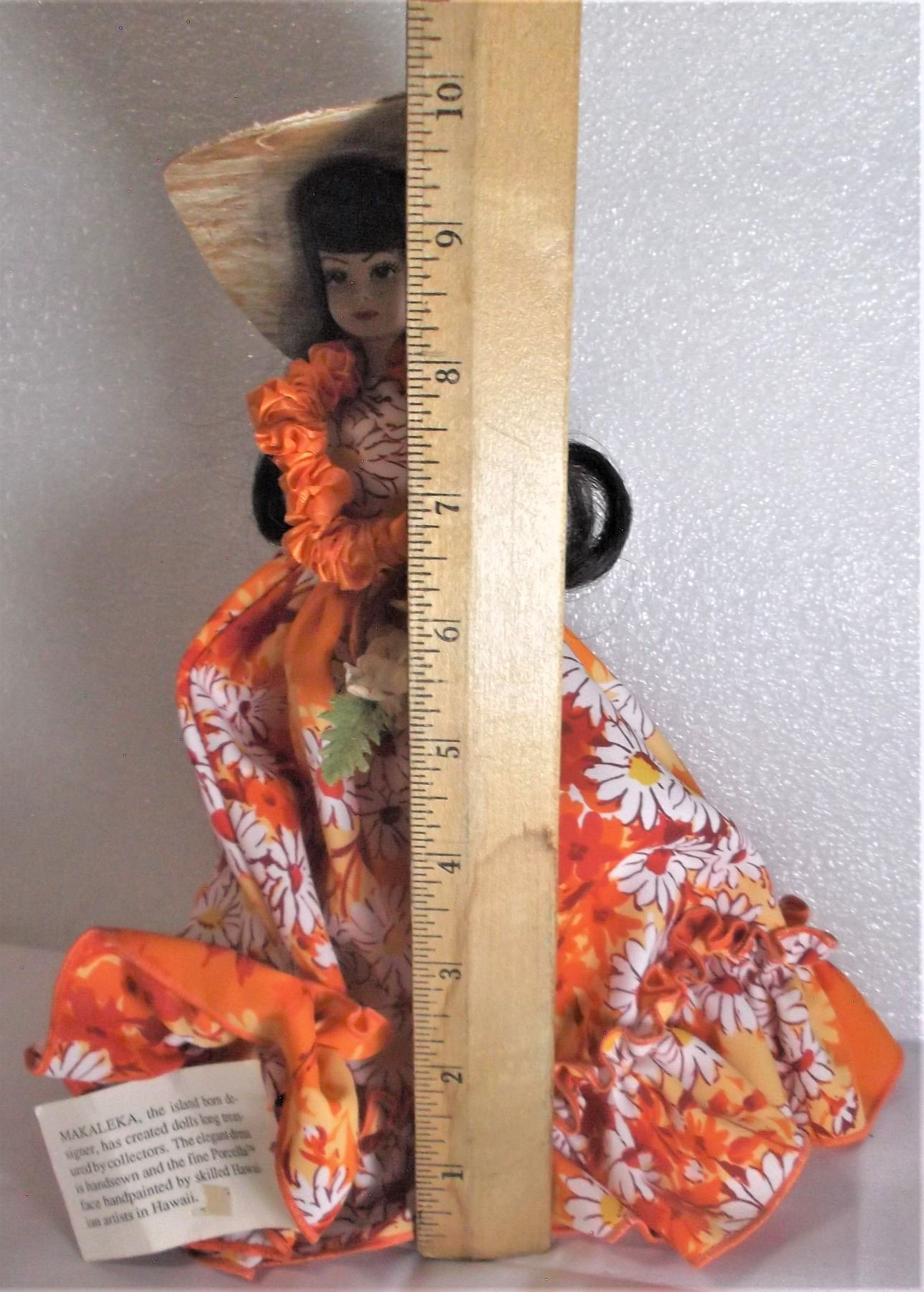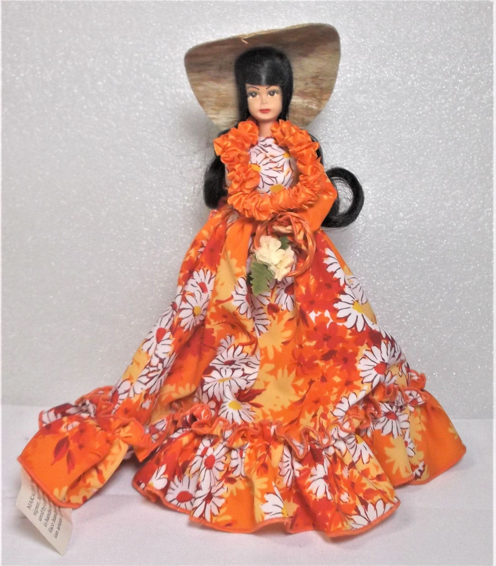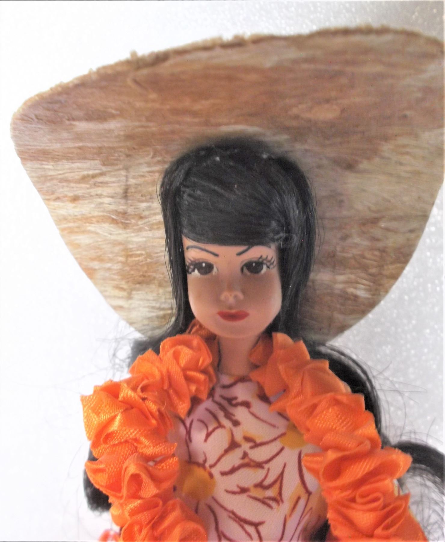 Handmade in Hawaii in the 1970s with natural "tapa mache" materials.Her hat is also made of tapa mache. , and she carries a headdress for the visitor. 9-1/2" tall.