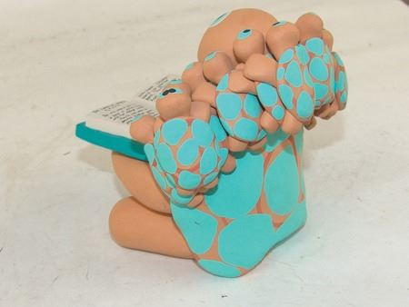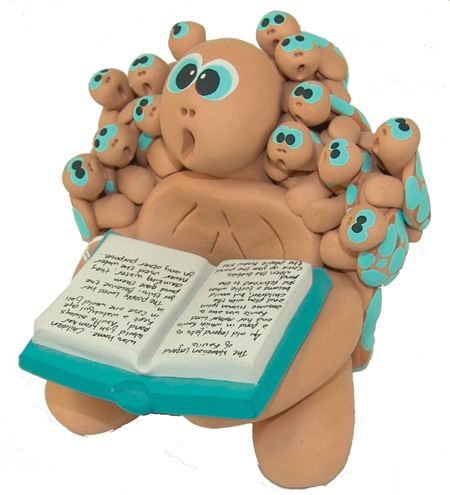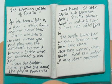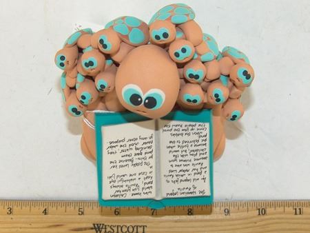 Ca. 2006, Unique seated storyteller turtle figure with 13 babies listening to "The Hawaiian Legend of Kauila." Very good condition. 4-1/2" x 5" x 4-1/2"
