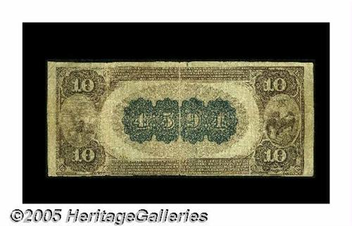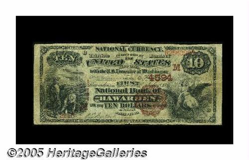<B>Hawarden, IA</B></I> - $10 1882 Brown Back Fr. 485 <B>The First NB</B></I> Ch. # (M)4594<BR>While small notes from here are hardly scarce, large examples are another story altogether, with just five pieces reported from this institution, the town's only large size issuer. Just two Brown Backs are reported, this example and one $20. <B>Fine.</B></I>