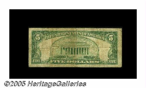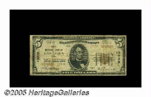 <B>Hawarden, IA</B></I> - $5 1929 Ty. 2 <B>The First NB</B></I> Ch. # 13939<BR>This is the only single note known from this short-lived high charter bank, with the only other notes reported from this institution in the form of an uncut serial number 1 $10 Ty. 2 sheet which has never been publicly offered. Neither has this piece, making this the first opportunity for any collector to own a note from this just plain rare bank. <B>Very Good.</B></I>