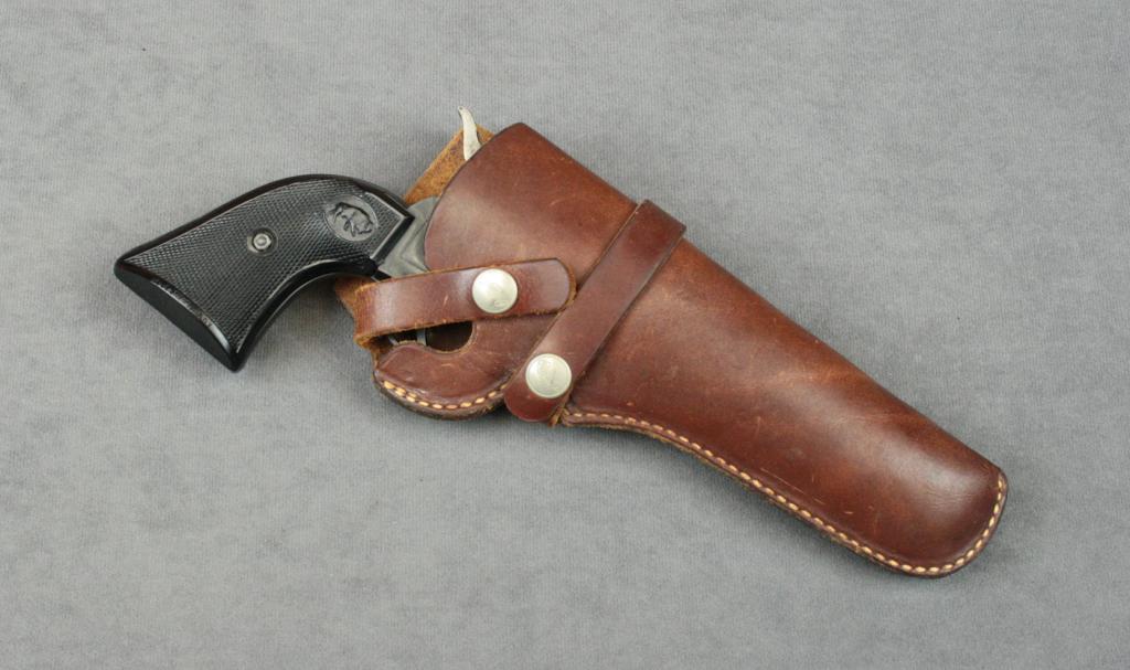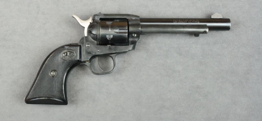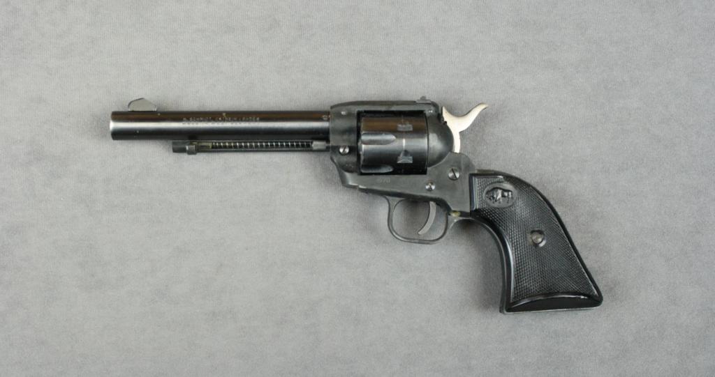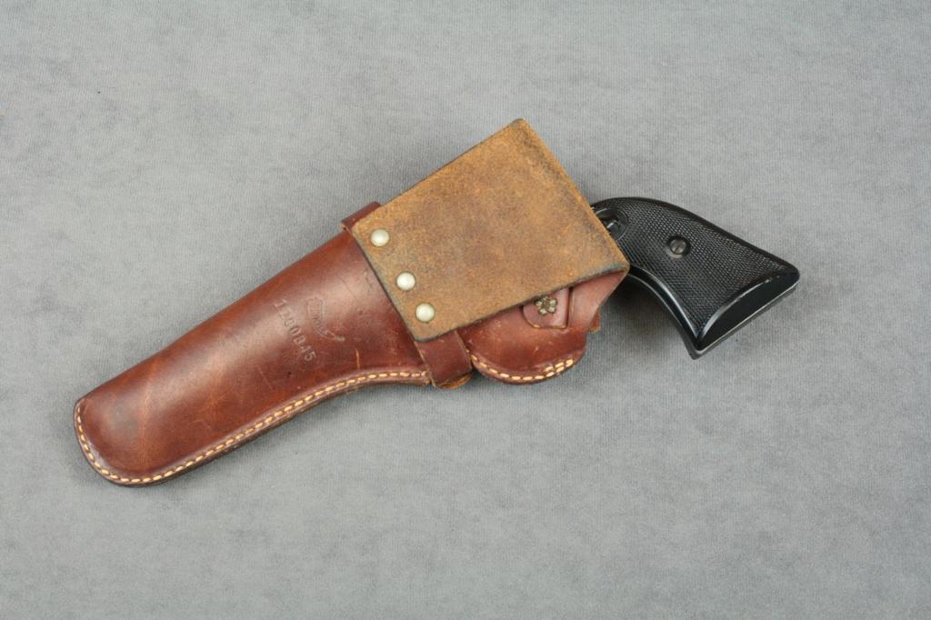 Hawes Arms Co. German-made copy of a Colt SAA  revolver, .22LR cal., 5-1/2” barrel, black  finish, checkered hard rubber grips, #529374.  This gun is in overall fine condition  showing approx. 90% original finish, crispaction, sharp markings, good bore, very good  grips; accompanied by a Hunter brand leather  holster.  Est.:  $250-$500.