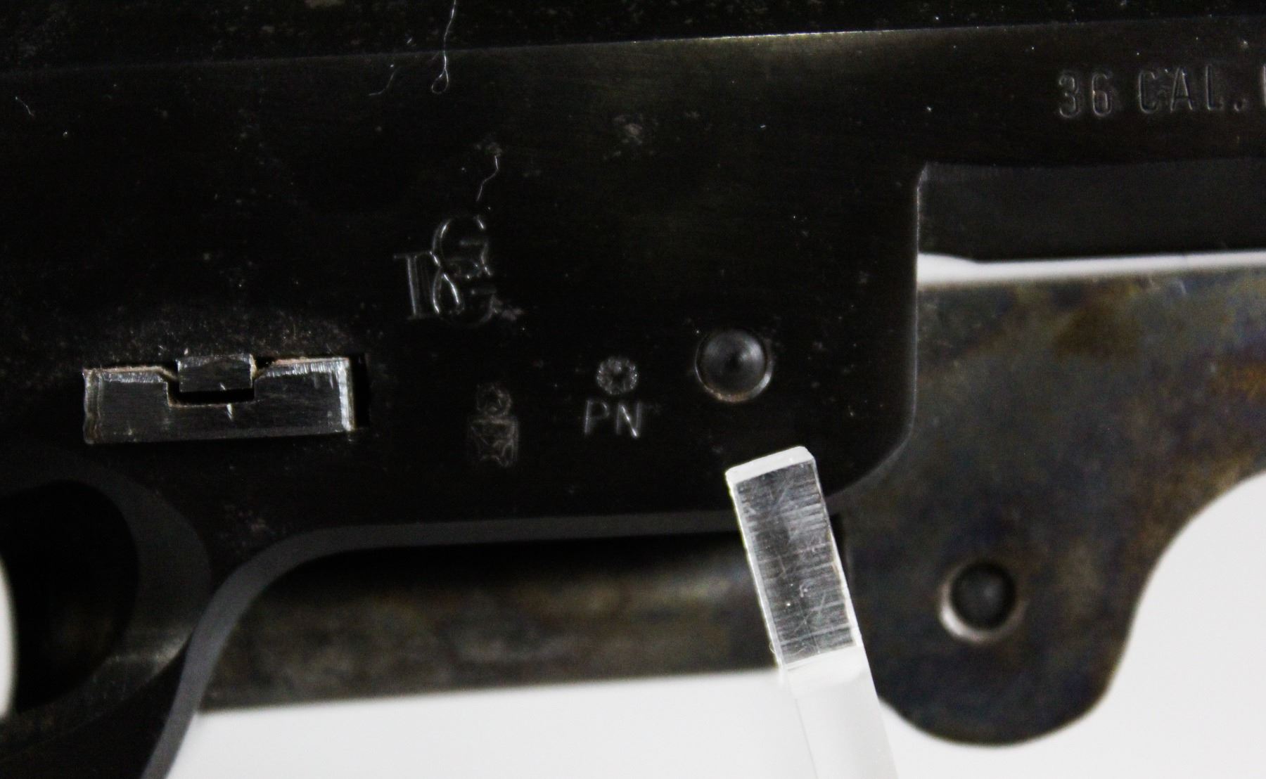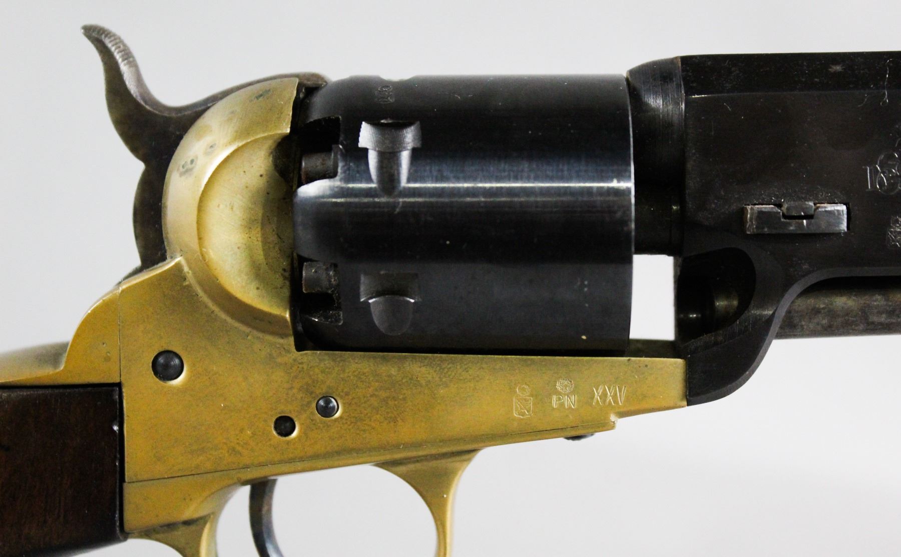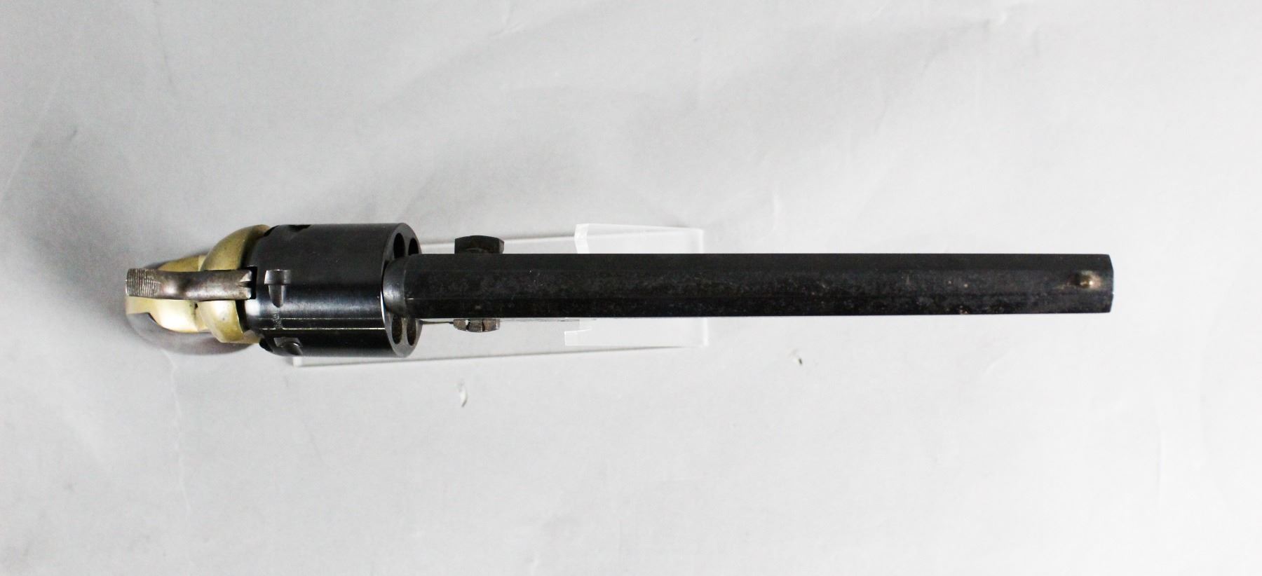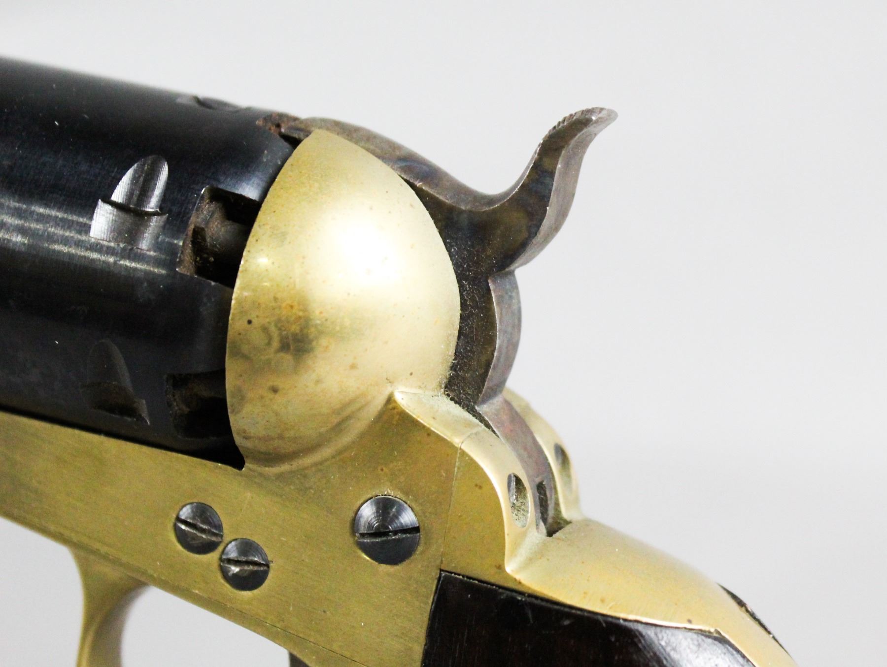 A blackpowder cap and ball revolver chambered in .36 caliber. Barrel and cylinder have a blued finish, barrel has some oxidation on top of barrel. The wood grips are in good condition. Bore has some rust in it. See photos.