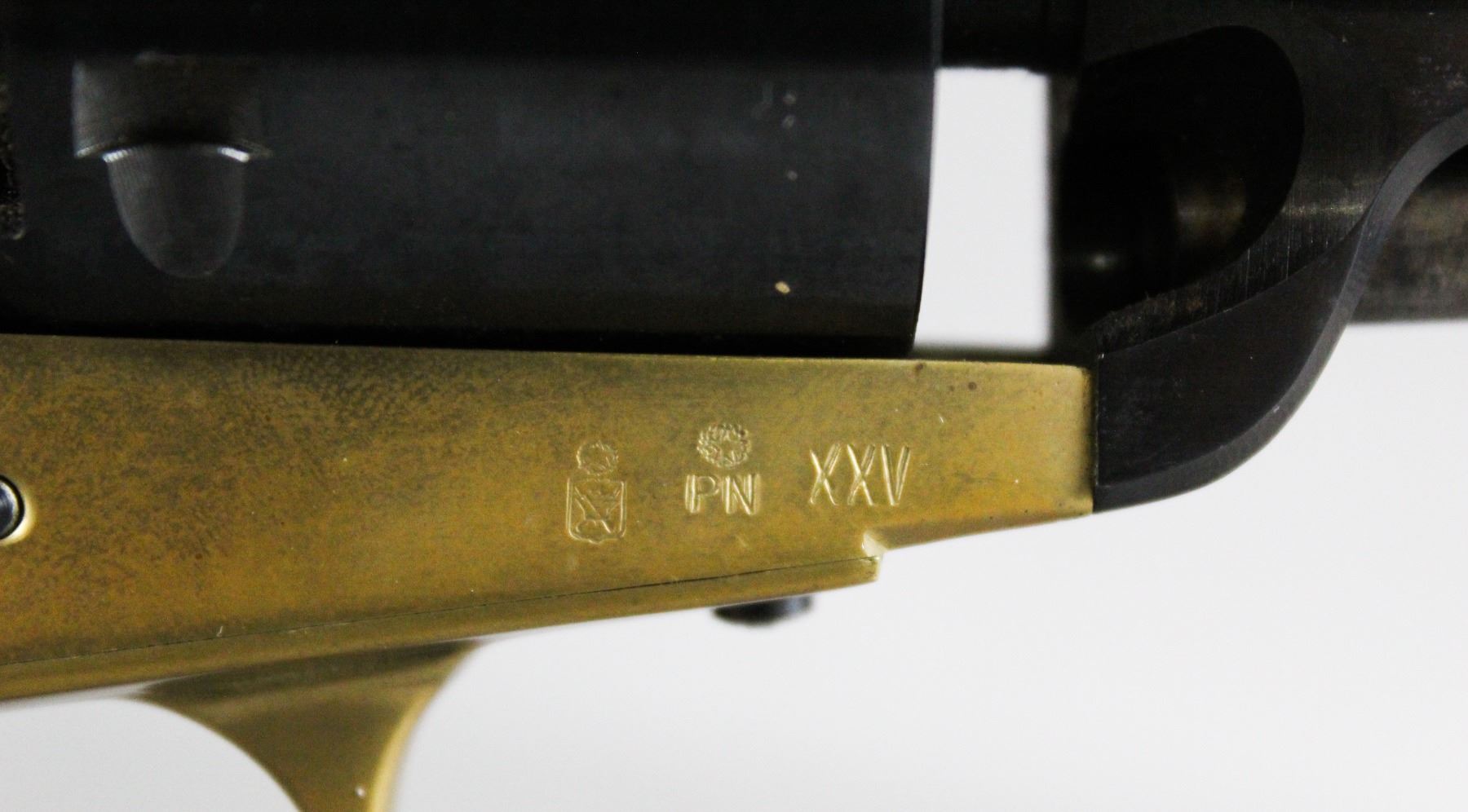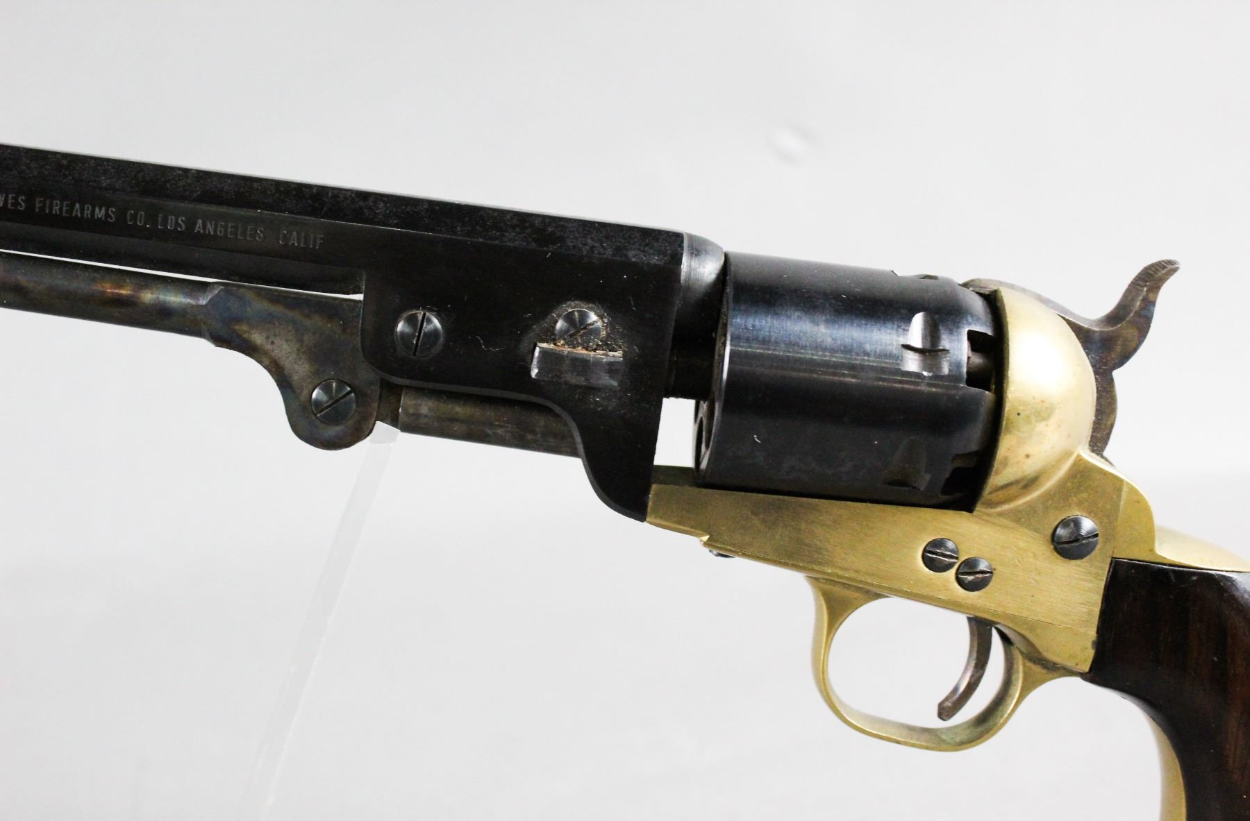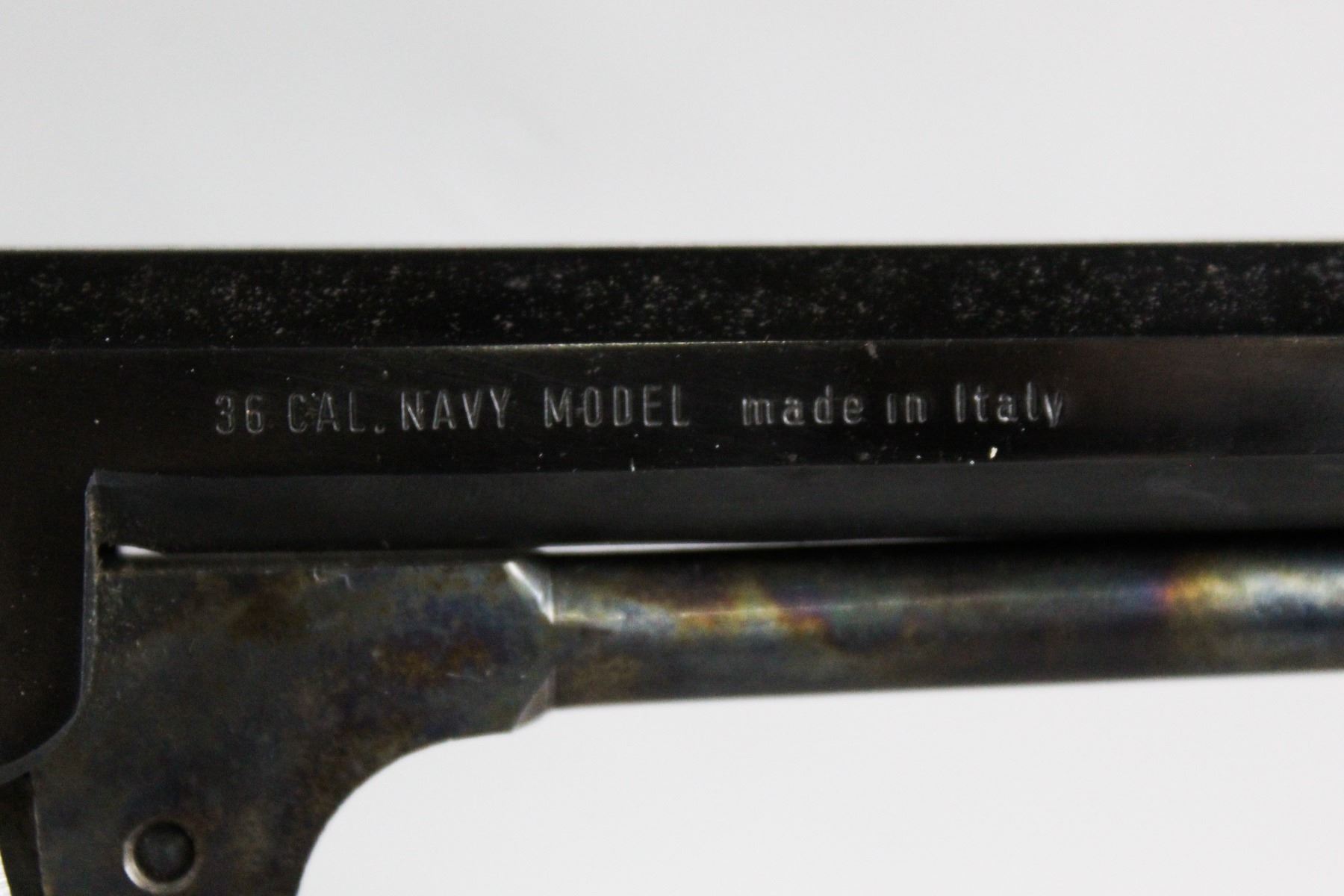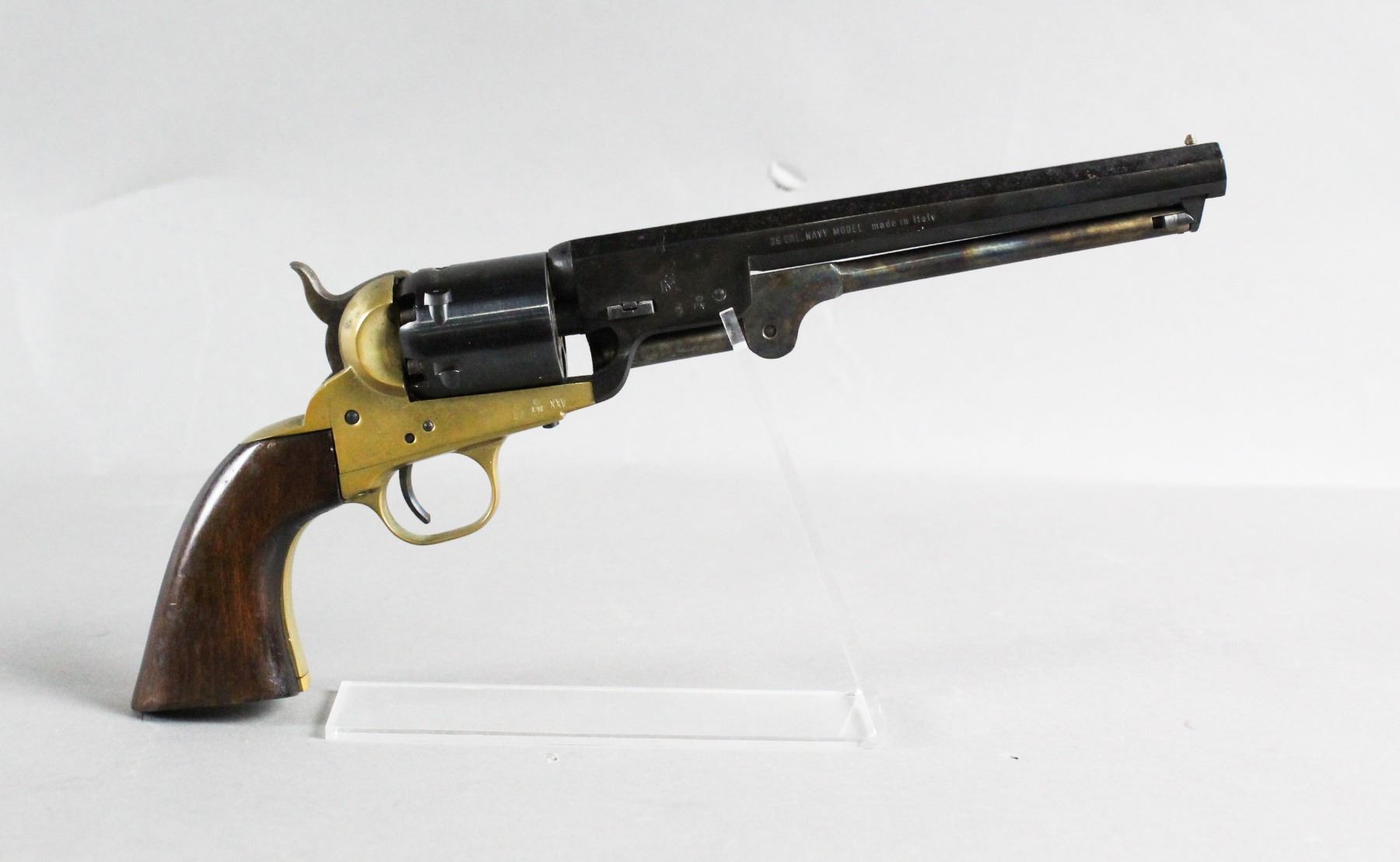 A blackpowder cap and ball revolver chambered in .36 caliber. Barrel and cylinder have a blued finish, barrel has some oxidation on top of barrel. The wood grips are in good condition. Bore has some rust in it. See photos.