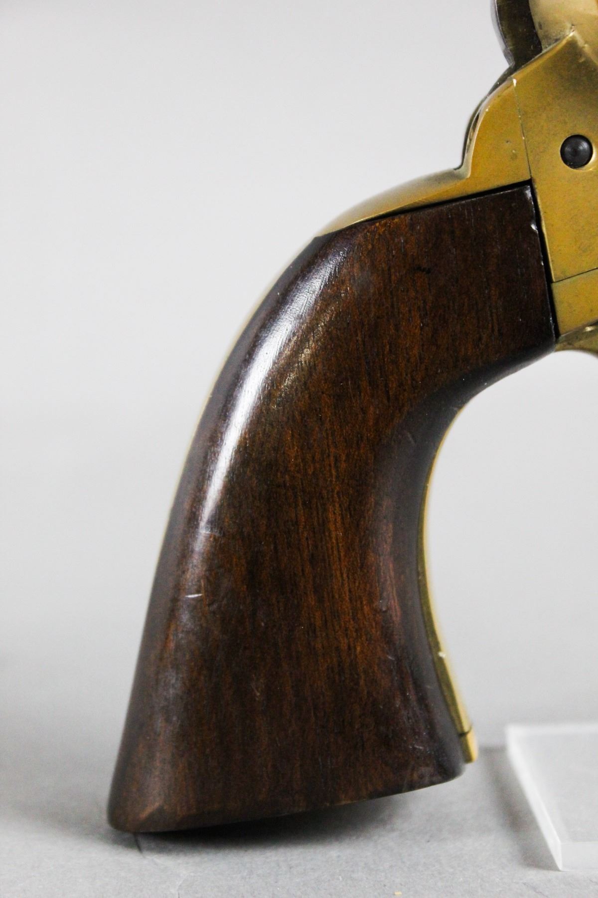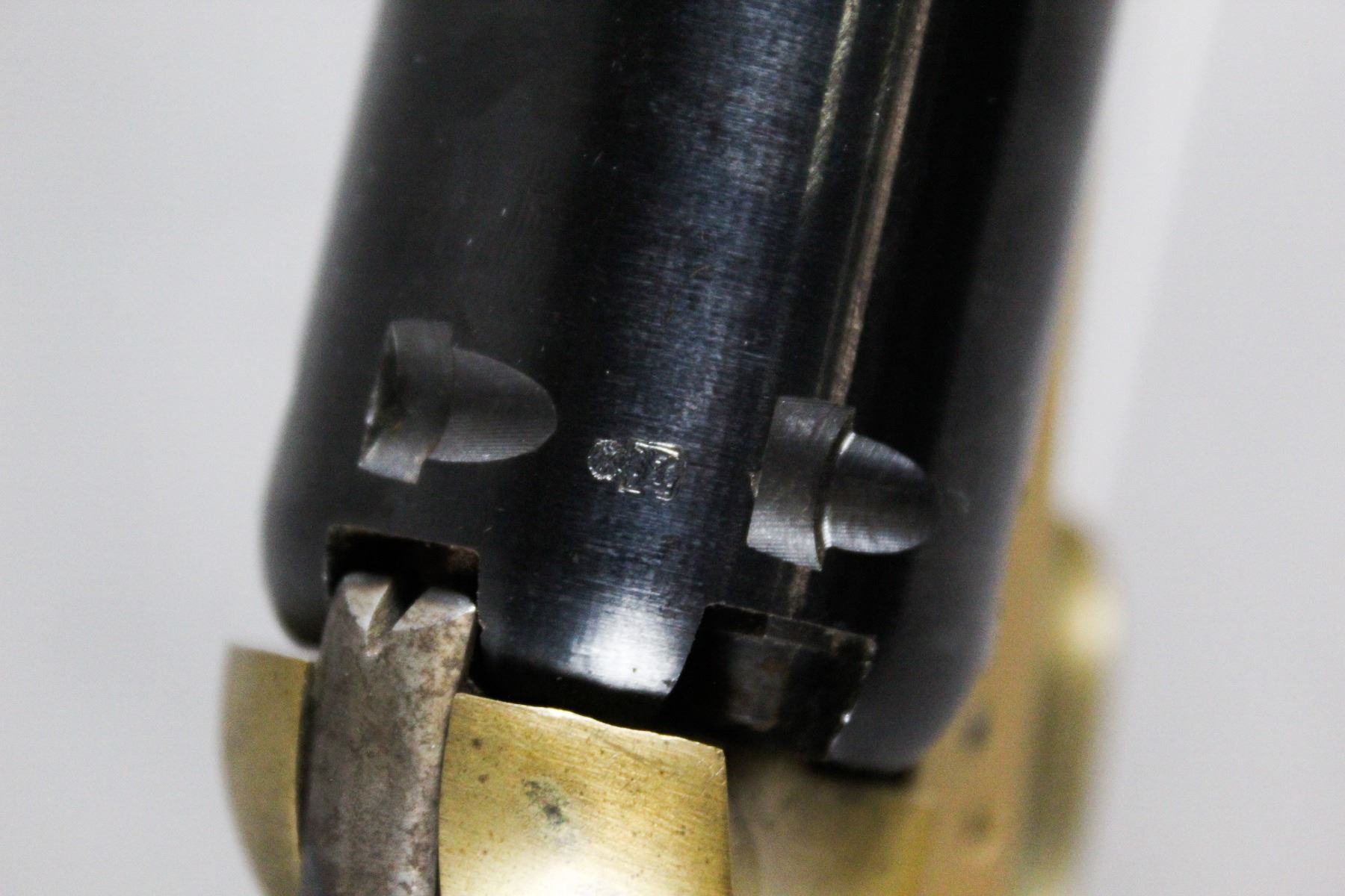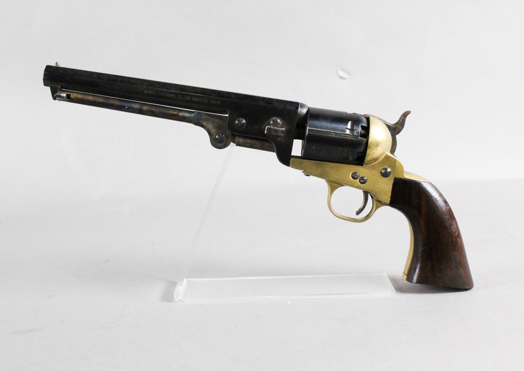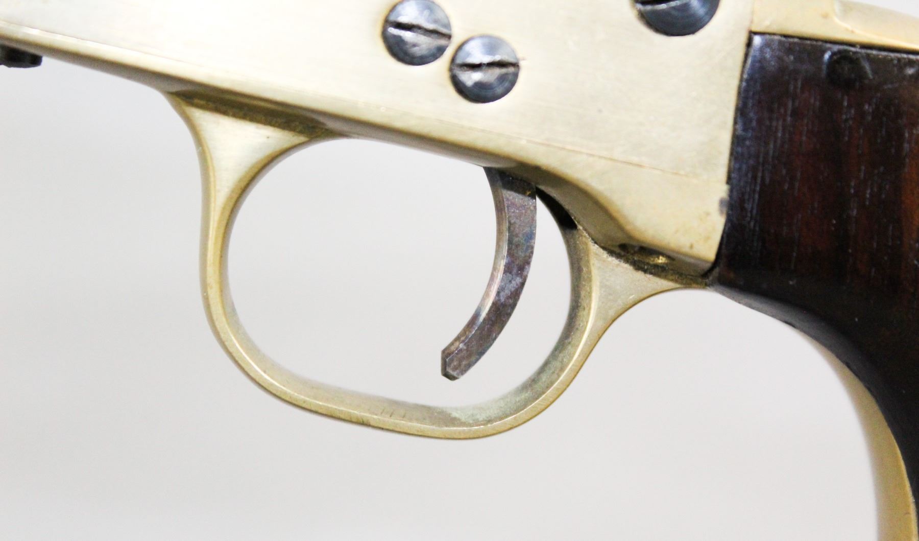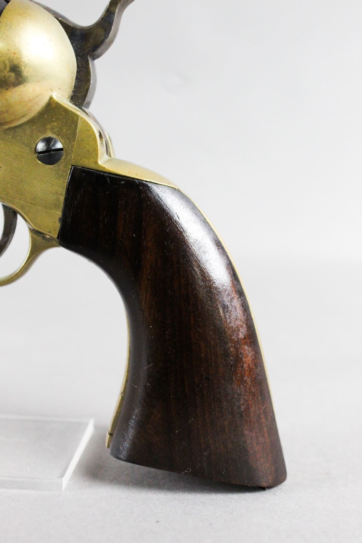 A blackpowder cap and ball revolver chambered in .36 caliber. Barrel and cylinder have a blued finish, barrel has some oxidation on top of barrel. The wood grips are in good condition. Bore has some rust in it. See photos.