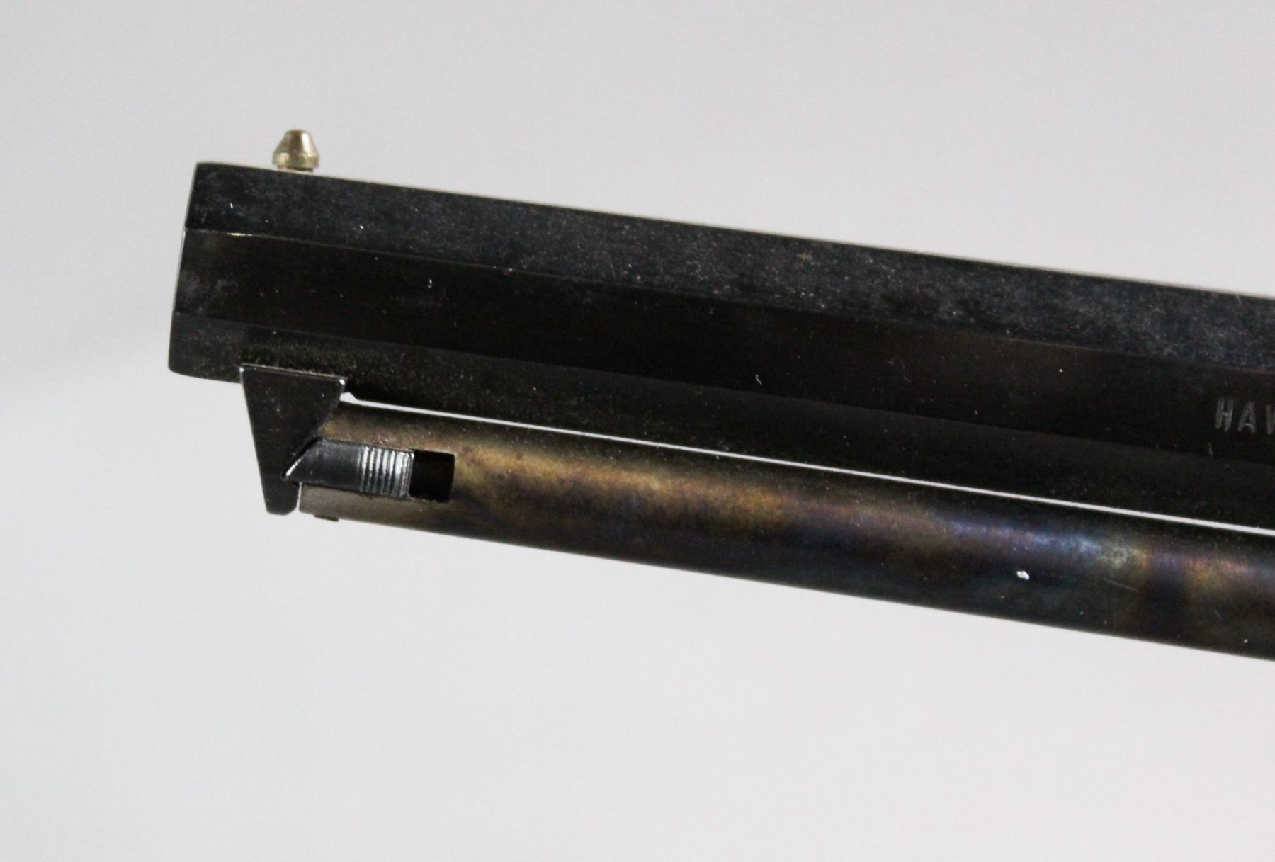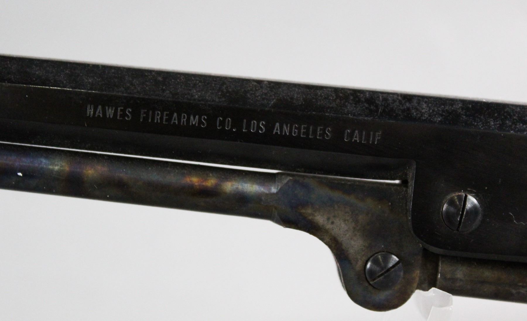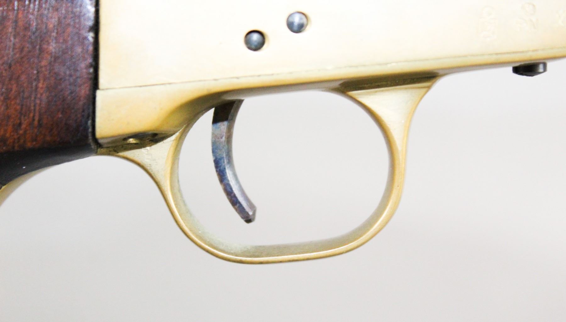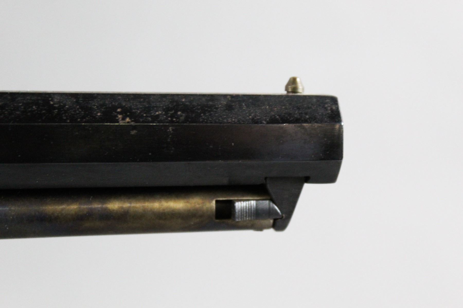 A blackpowder cap and ball revolver chambered in .36 caliber. Barrel and cylinder have a blued finish, barrel has some oxidation on top of barrel. The wood grips are in good condition. Bore has some rust in it. See photos.