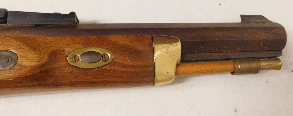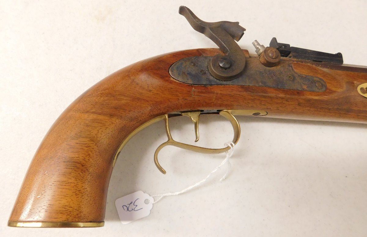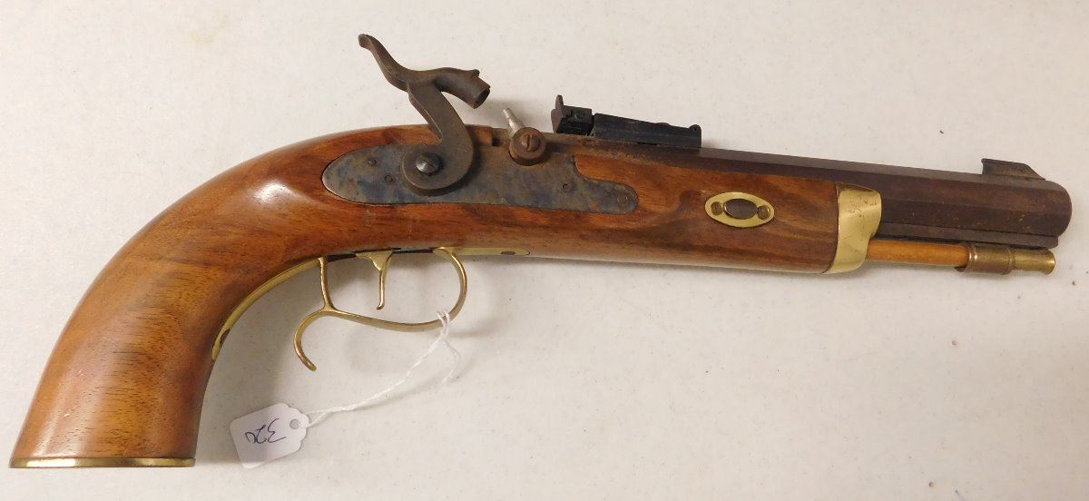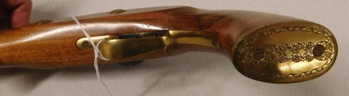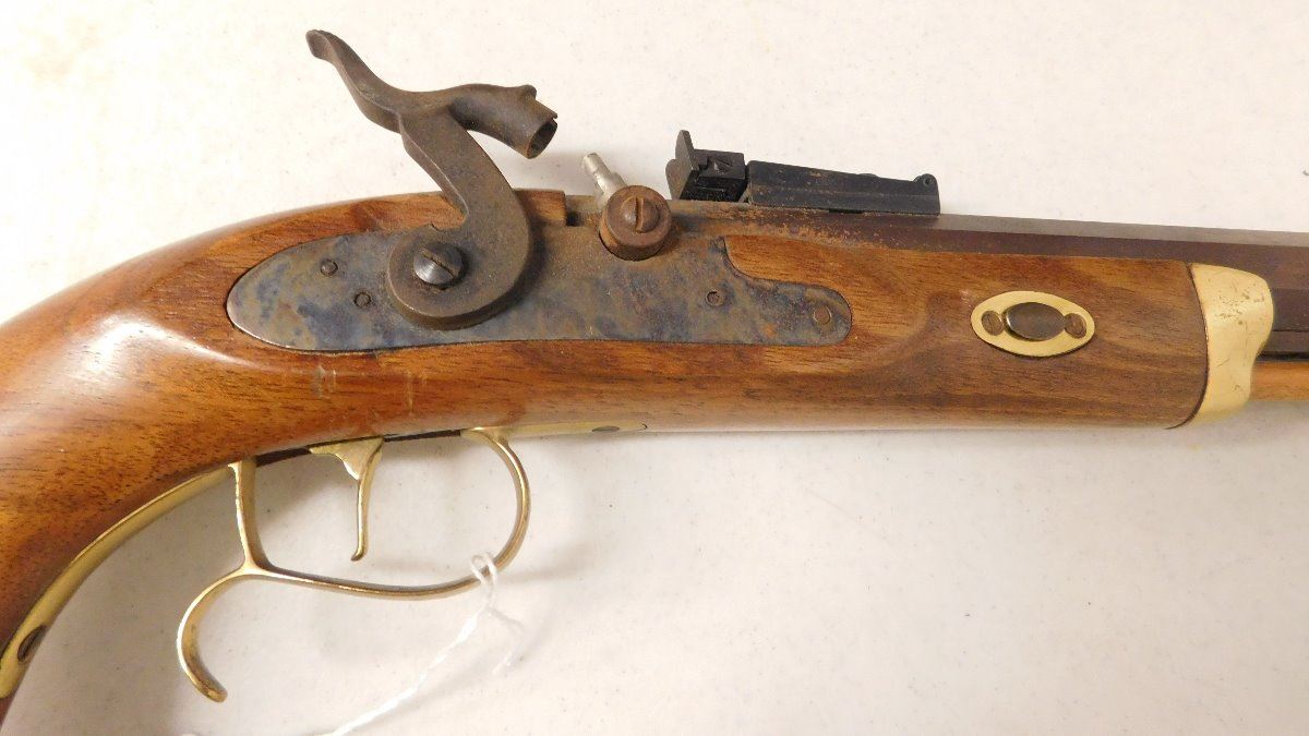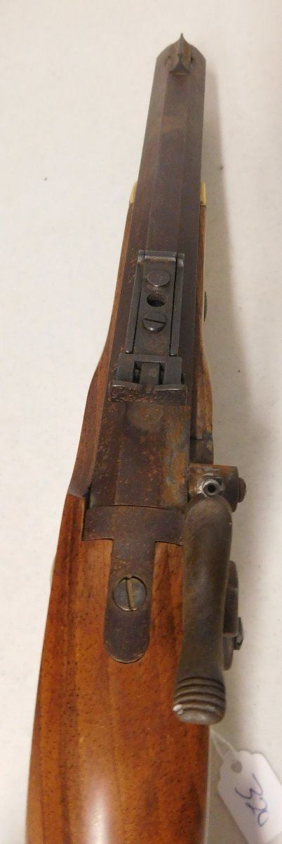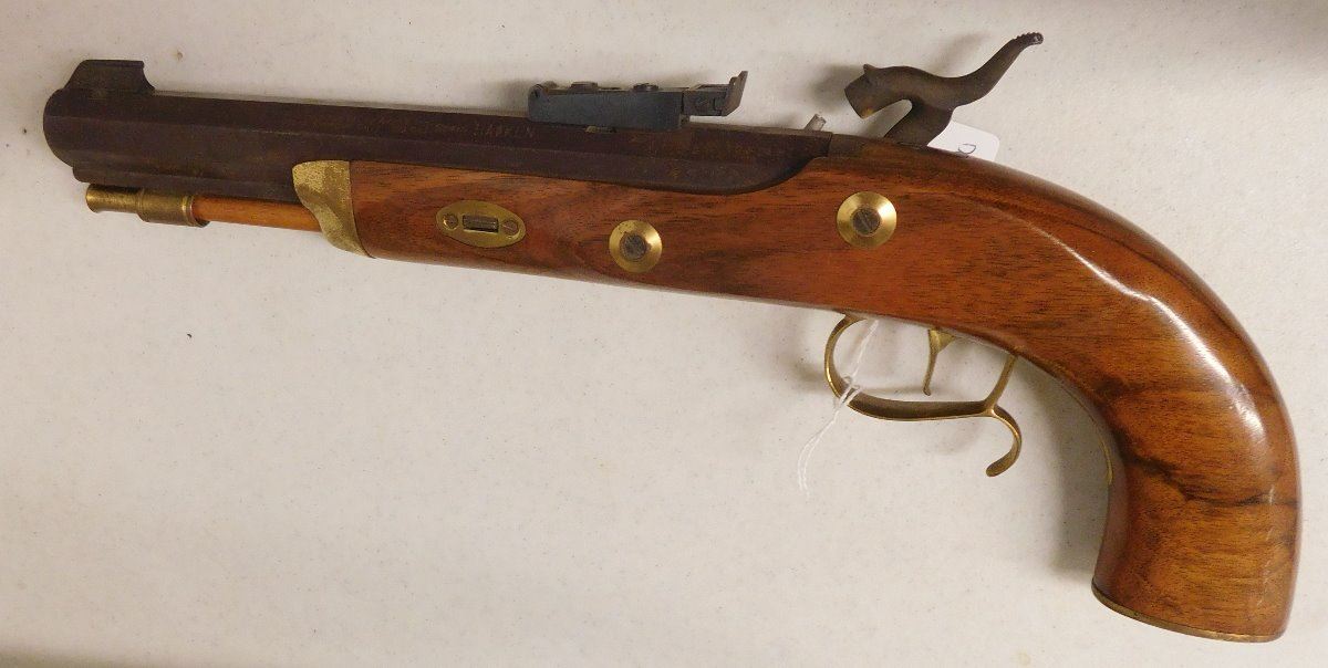 Hawken Percussion Pistol, 20th century item. Made of wood and steel, the item is .54 caliber, 15.5" x 6" x 2". USA. Famous maker, heavy pistol. Condition: Very good, shooter, see images. Shipping: $30.00 w/insurance and signature.