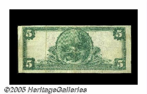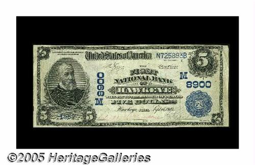<B>Hawkeye, IA</B></I> - $5 1902 Plain Back Fr. 600 <B>The First NB</B></I> Ch. # (M)8900<BR>A scarce note with a great Iowa town name. It comes along with a rather remarkable real photo postcard of the interior of the bank showing the ornately decorated vault door in the back of the bank with the bank's cashier, Clyde A. Munson (who signed this note) standing in front of the vault. The postcard, which is unused, is inverted. The note, which grades a pleasing <B>Fine-Very Fine,</B></I> is not.