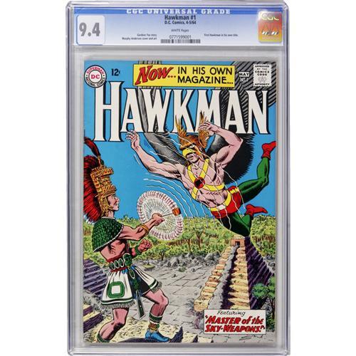 <B>Hawkman #1 (DC, 1964) CGC NM 9.4 White pages.</B></I> Great page quality! Hawkman gets his own title with this issue and Murphy Anderson provides the Mayan cover and art. Overstreet 2006 NM- 9.2 value = $1,025. CGC census 3/07: 8 in 9.4, 1 higher.<BR><BR><b>Shipping:</b> Comics - Slabbed (certified) (<a target="_blank" href="http://www.heritageauctions.com/common/shipping.php">view shipping information</a>)