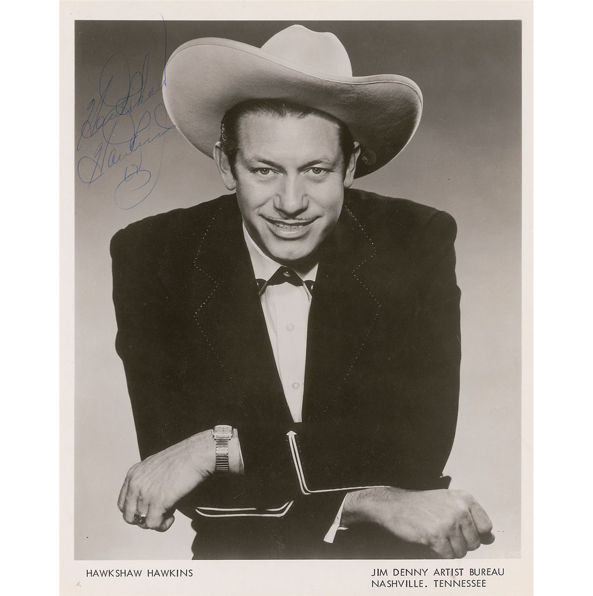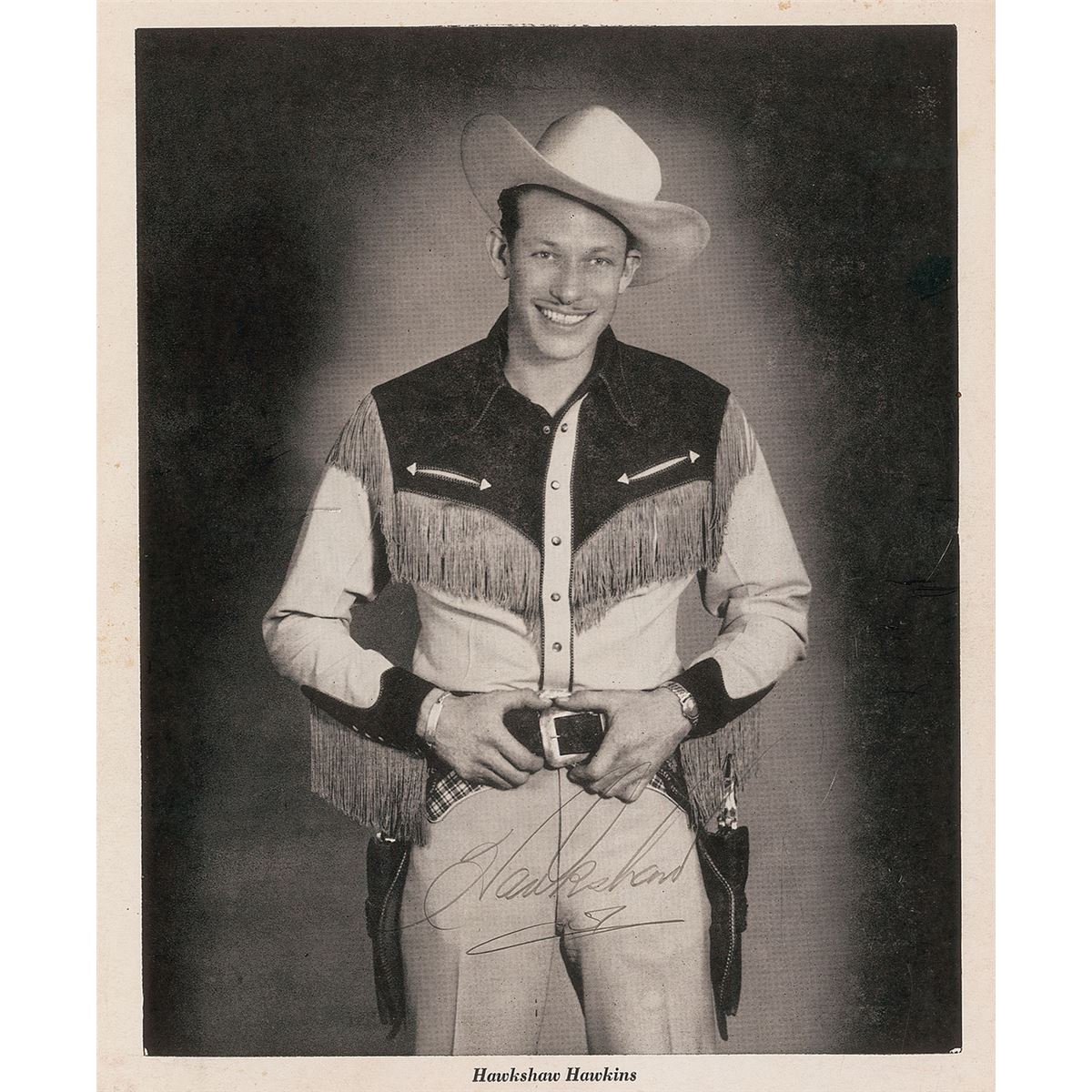 Two photos: a glossy 8 x 10 publicity photo of Hawkins in a dark suit, signed in blue ballpoint, “Hawkshaw Hawkins”; and a 8.75 x 10.75 cardstock publicity photo of Hawkins in western attire, signed in pencil, “Hawkshaw.” In overall fine condition, with a few spots of foxing to borders of the second photo.
