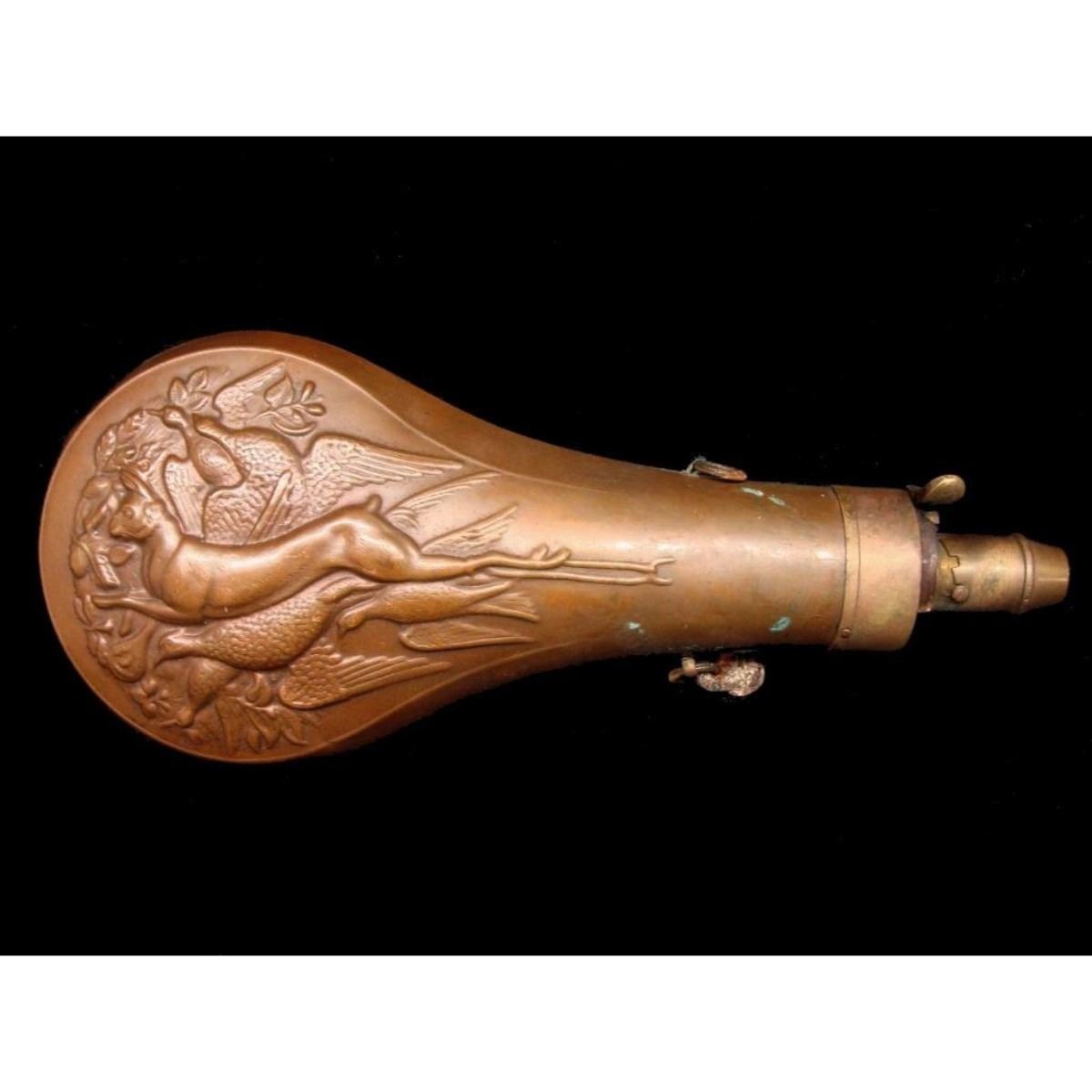 Nicely detailed antique copper black powder flask from a local estate. Done in a G & J.W. Hawksley style, the flask measures 8 1/2" and is embossed with a hanging game motif of wild game birds, a rabbit, and foliage. The flask has lanyard loops on both sides and a 3-step graduation at the top. The fine ageing of the patina gives the piece a deep rich color