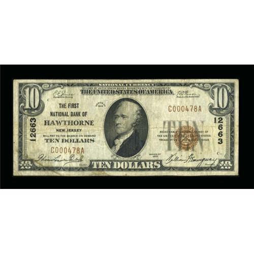 <B>Hawthorne, NJ</B></I> - $10 1929 Ty. 1 <B>The First NB</B></I> Ch. # 12663<BR> A scarce Passaic County bank which issued small size notes only. This is the first example we've had to offer from this community since our May, 1991 sale. <B>Fine.</B></I><BR><BR><b>Shipping:</b> Coins & Currency (<a target="_blank" href="http://www.heritageauctions.com/common/shipping.php">view shipping information</a>)