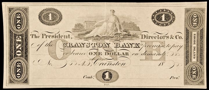 Cranston, RI. The Cranston Bank. One Dollar. Proof Impression Reprint From the Original Reed Plate. Light Yellow India Paper. Choice Crisp About Uncirculated.