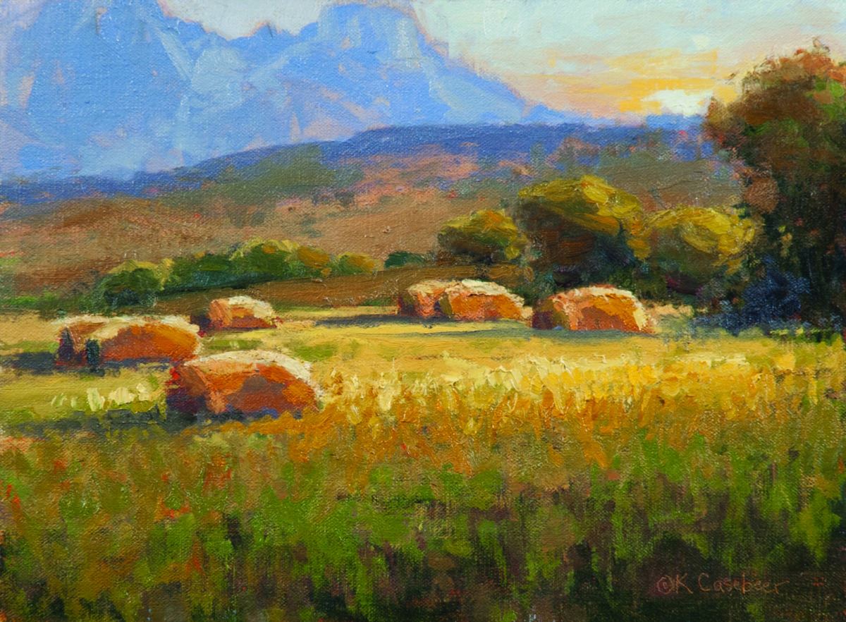 Artist: Kim Casebeer. Title: Hay Field at Dawn. Medium: Oil on linen. Size: 9" x 12". Framed size (if applicable): 15.5" x 18.5" Artist's description: I've painted this particular hay field several times and love it because of the unique, stacked haybales. It's close to Wilson, which is near Jackson, Wyoming. The Tetons are in the background. The light was beautiful on this particular early fall morning when I was out painting! Shipping from ZIP CODE 66503.