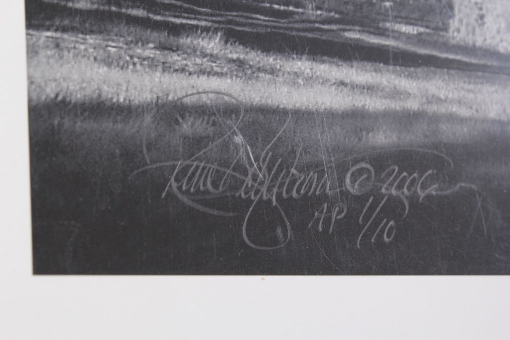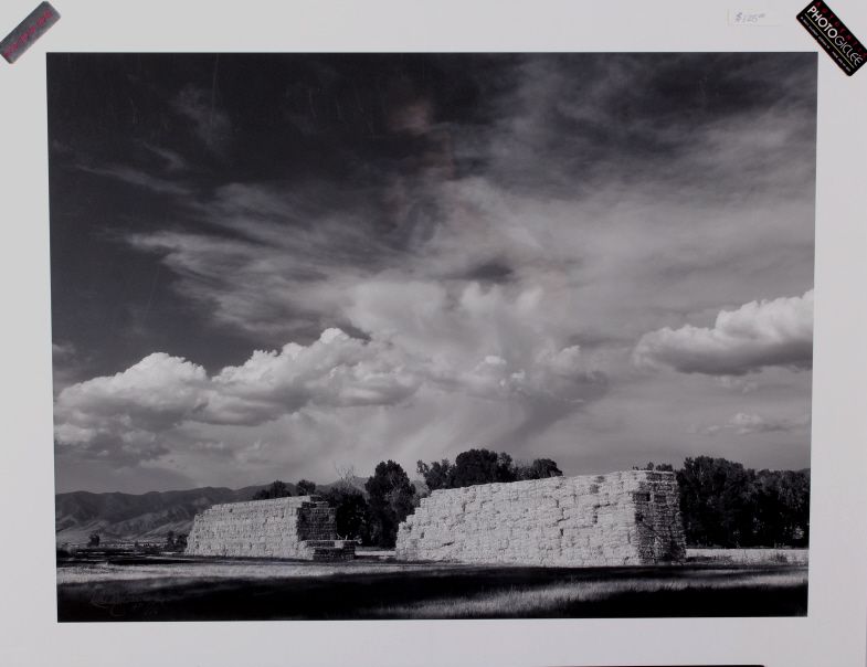 This is an original work of art photographic giclee print that Rein shot in 2006. This original shows fantastic black and white details of a the Bridger Range in the background with a stack of Montana hay and flowing majestic clouds. This is an Artist Proof numbered 1/10. The piece is hand signed and titled by the artist. Rein is a Bozeman, Montana artist whose works hang in many Montana Homes. This is shrink wrapped backed on foam core that measures 22.25"x28.5". The artwork measures 18.25"x24.5"