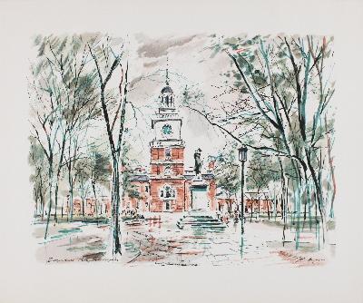Reference #: ULYY9694 Artist Name: Haymson, John Title: Independence Hall, Philadelphia Medium: Lithograph Edition Size: Unknown Year: Unknown Paper Size: 23 x 28 inches Image Size: 18 x 24 inches Condition: A-: Near Mint, very light signs of handling