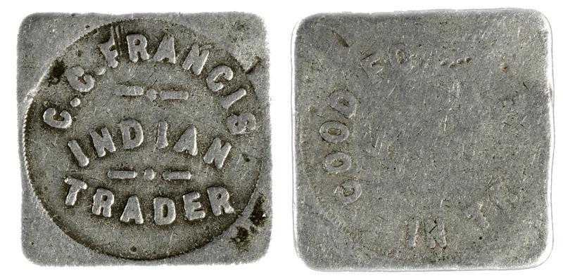 R10. Obverse: C.C. Francis / Indian / Trader; reverse: Good For / 5c / In Trade. Al, 25mm, R10. Obverse good condition, reverse about good with denomination extremely worn. Loacted 50 miles southeast of Farmington. On New Mexico 56.