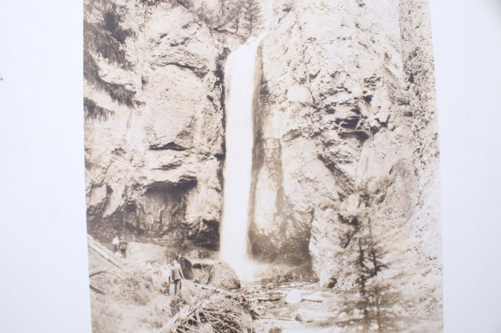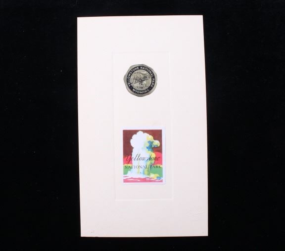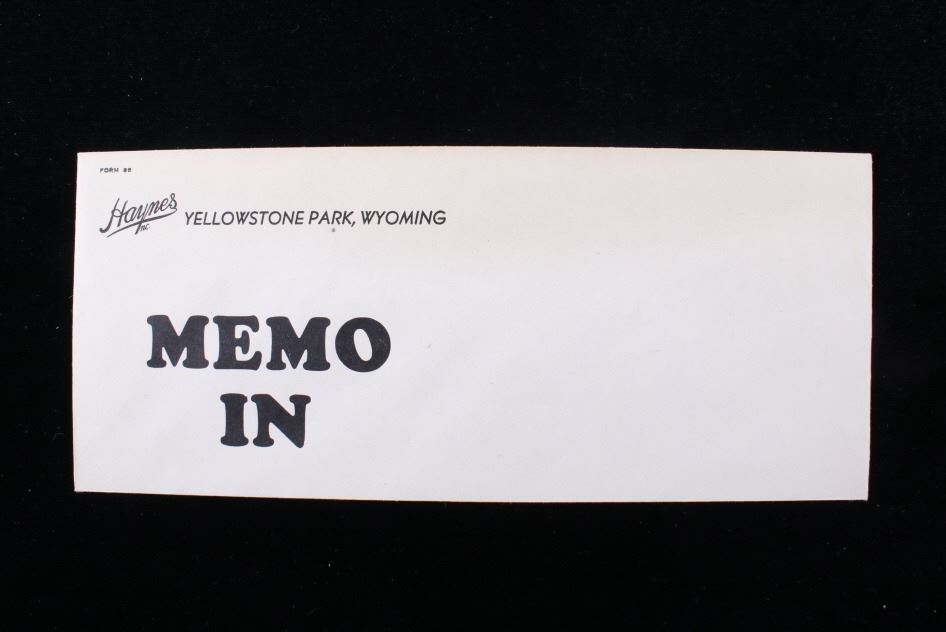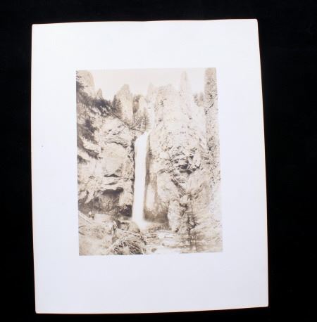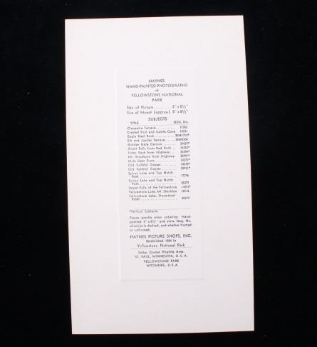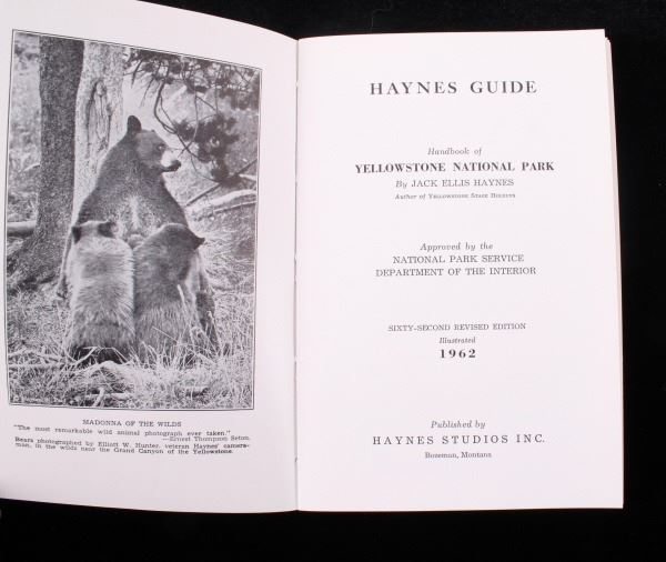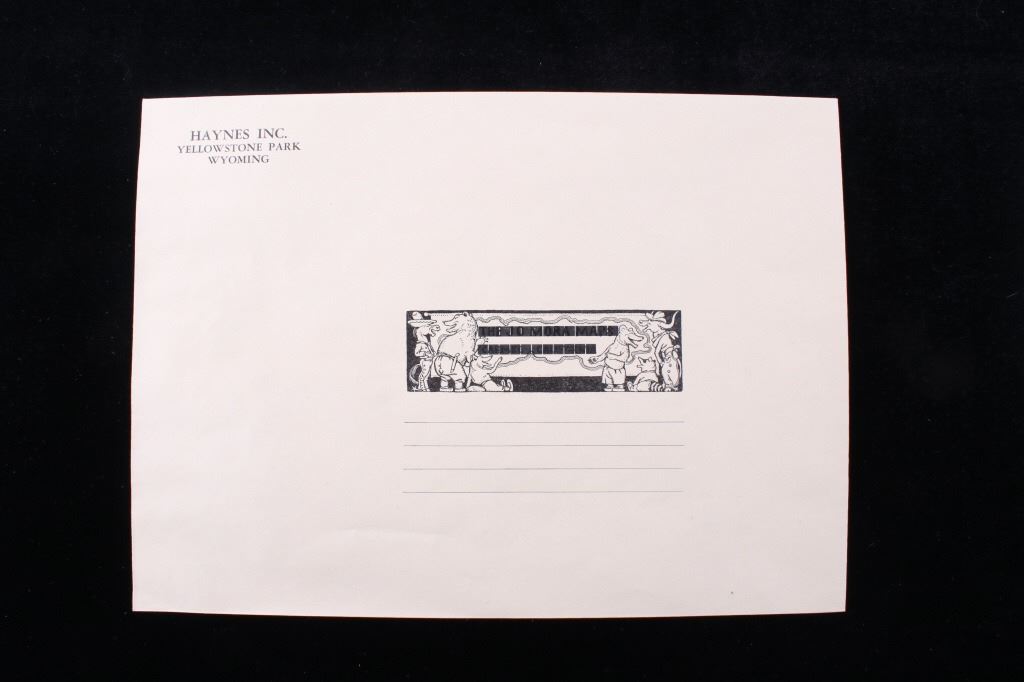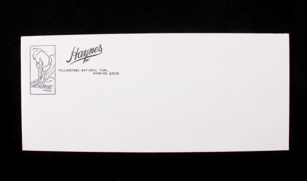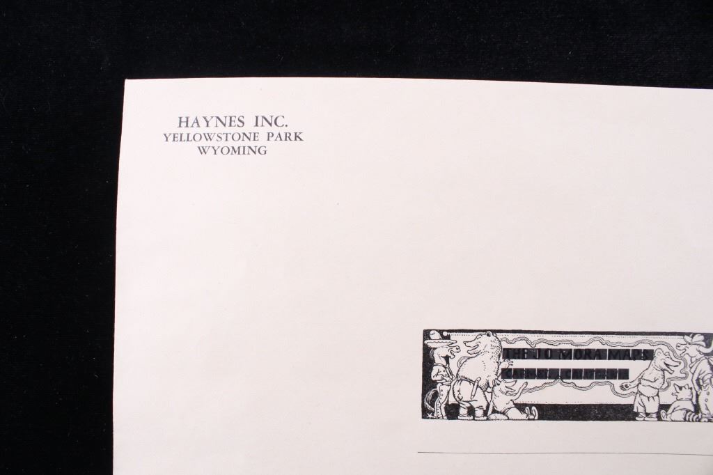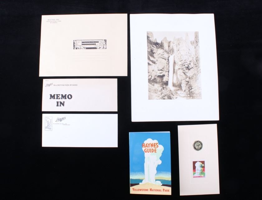 Featured in this lot we have a collection of Frank Haynes Yellowstone Park guide, original photo, a small painting and letter heads. The collection consists of a Haynes guide to Yellowstone, a large photograph, a small painting, and three Yellowstone letter heads. The Haynes Guide Handbook of Yellowstone National Park by Jack Ellis Haynes shows general information on the park and is the 62nd revision. The small painting is of Old Faithful Geyser. The photograph is of Tower Falls located in Yellowstone National Park and is from the early 1900s. The final three pieces are Haynes Yellowstone National Park letter head envelopes. The collection shows good condition overall with little to no wear. The photograph measures 11" by 14". The largest letterhead piece measures 11 1/4" wide by 8 1/4" tall with the smallest measuring 7 1/2" tall by 5" wide. The guide measures 7 1/2" by 5".