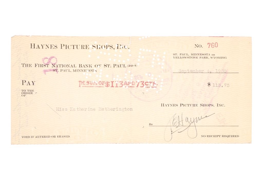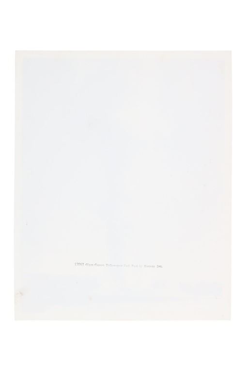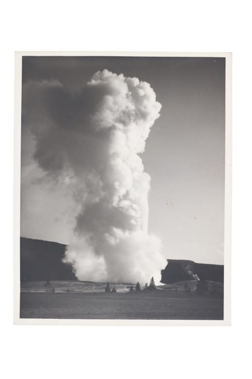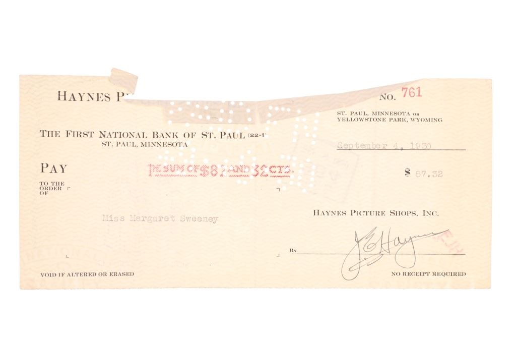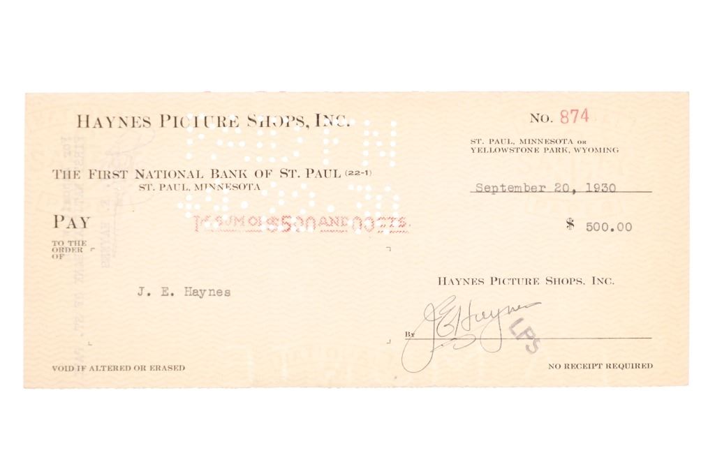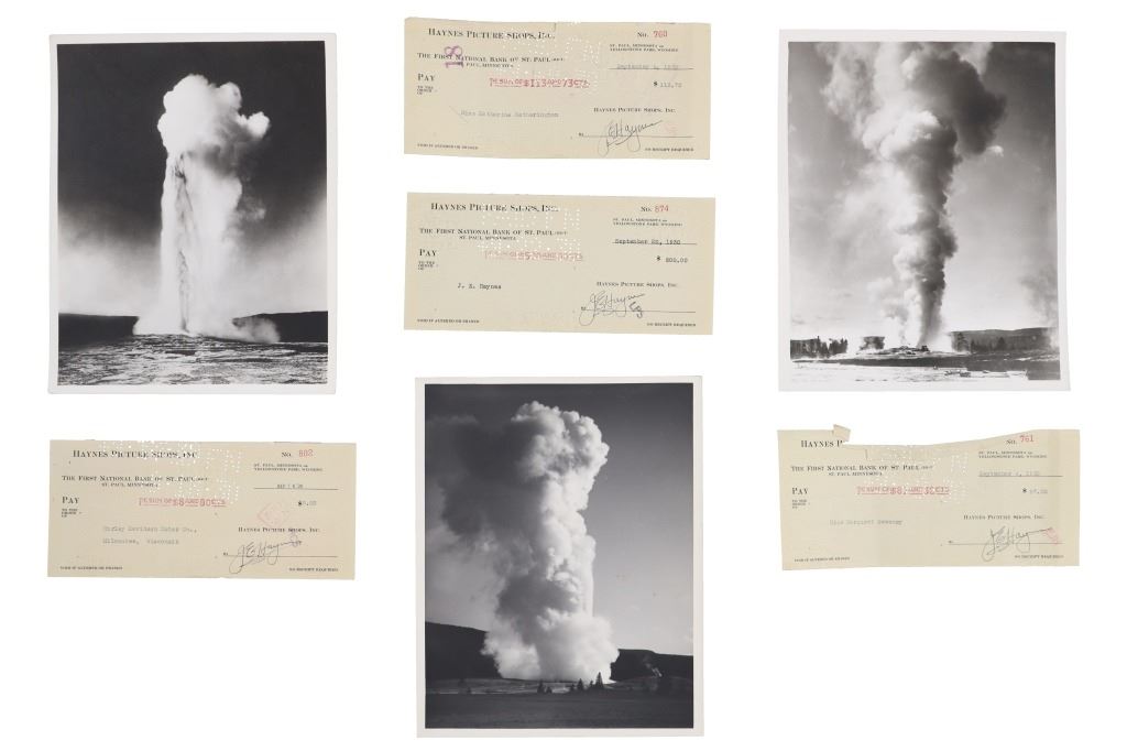 For your consideration are Original F. J. Haynes photographs and ephemera of Yellowstone National Park, circa 1930s. The photographs are are all large format photographs of Yellowstone National Park and are all stamped with the Haynes hallmark. Also included are cancelled checks with Jack Haynes signature and Haynes Store envelopes for Jo Mora maps. Frank Jay Haynes, known as F. Jay or the Professor to almost all who knew him, was a professional photographer, publisher, and entrepreneur from Minnesota who played a major role in documenting through photographs the settlement and early history of the great Northwest. He became both the official photographer of the Northern Pacific Railway and of Yellowstone National Park as well as operating early transportation concessions in the park. His photographs were widely published in articles, journals, and books, and turned into stereogrpahs and postcards in the late 19th and early 20th century. Jack, like his father, was a photographer, and inherited the family business and continued as the official Yellowstone National Park photographer until his death in 1962. In 1921, when Frank died, Jack also inherited the physical studio outside of Yellowstone National Park and Frank’s archive of YNP photo negatives. Jo Mora was one of the foremost pictorial mapmakers of the 20th century, known for depicting places in the West such Yosemite, Yellowstone, and Grand Canyon National Parks; the Monterey Peninsula; San Diego; and Carmel-by-the-Sea. Today his maps are highly prized by collectors, with a Swann Auction Galleries 2023 auction sale for "The Seventeen Mile Drive" Carmel-by-the -Sea over $4500.00. The three (3) photographs are numbered and titled, "10160 Old Faithful Geyser, Sunrise", "13040 Old Faithful Geyser, Yellowstone Park", " 13063 Giant Geyser, Yellowstone Natl. Park". All are also marked, "Haynes Inc." The four (3) envelopes are marked at the top left corner, "Haynes Inc. Yellowstone Park Wyoming". The four (4) cancelled checks are marked, "Haynes Picture Shops, Inc. The First National Bank of St. Paul St. Paul, Minnesota" and dated September 1930. Photographs show good condition overall with little to no wear present and no signs of obvious damage present. The photos each measure 8"W x 10"L approximately. Envelopes are also in good condition with no wear, age tanning. Each measures 8.5"W x 11.25"L. Cancelled checks measure 3.75"W x 8.5"L. Collective weight is U6.