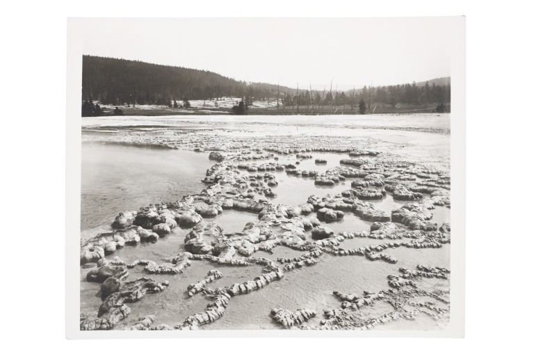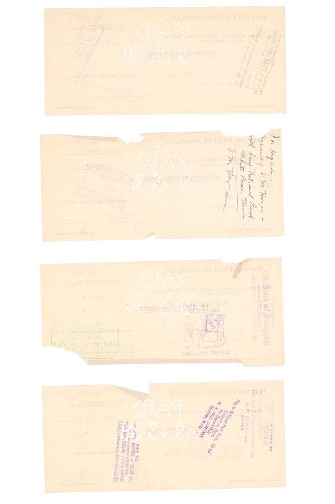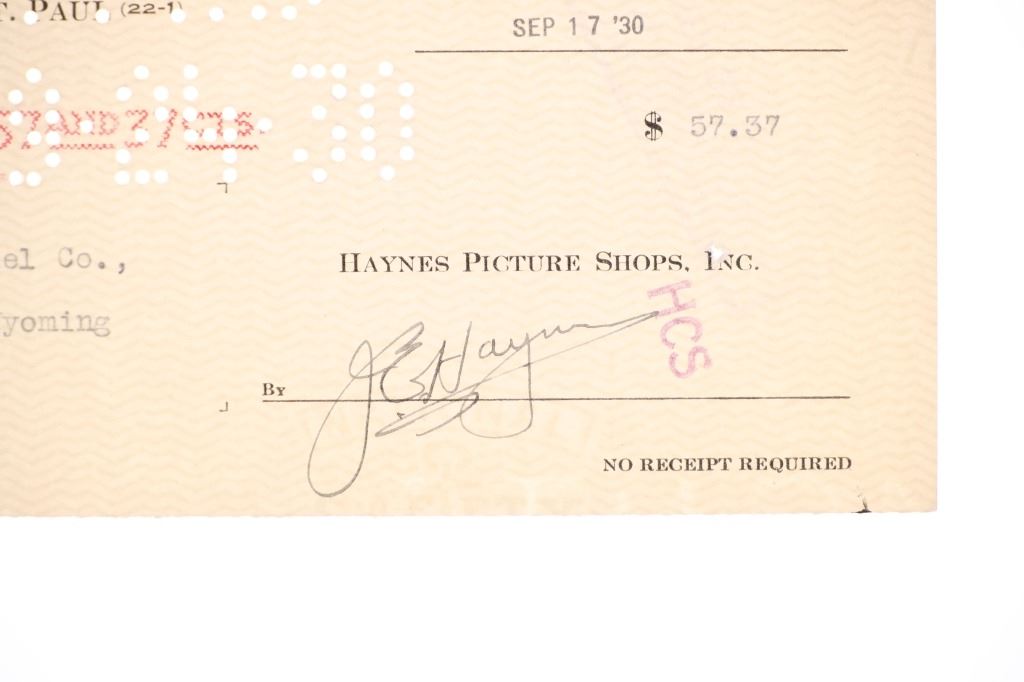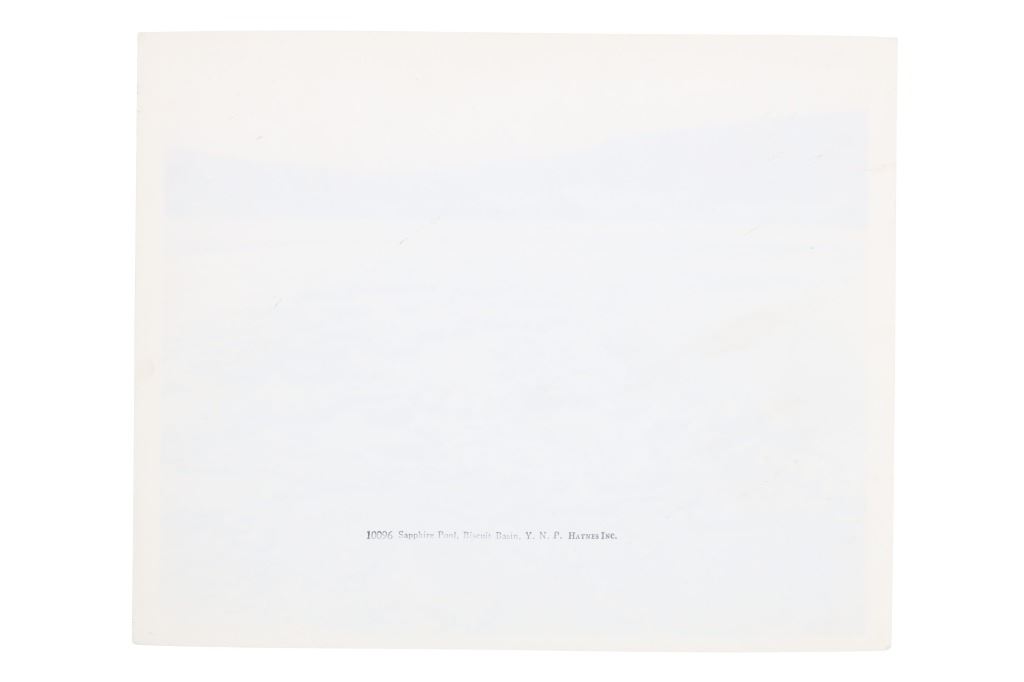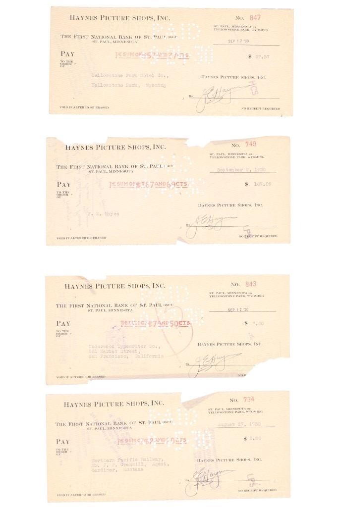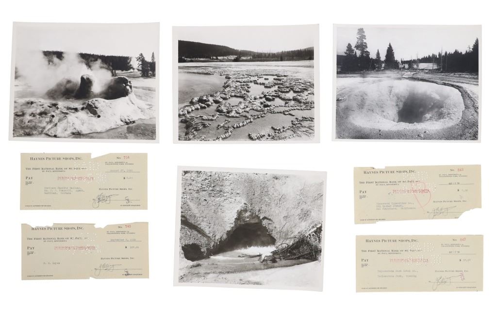 For your consideration are Original F. J. Haynes photographs and ephemera of Yellowstone National Park, circa 1930s. The photographs are are all large format photographs of Yellowstone National Park and are all stamped with the Haynes hallmark. Also included are cancelled checks with Jack Haynes signature and Haynes Store envelopes for Jo Mora maps. Frank Jay Haynes, known as F. Jay or the Professor to almost all who knew him, was a professional photographer, publisher, and entrepreneur from Minnesota who played a major role in documenting through photographs the settlement and early history of the great Northwest. He became both the official photographer of the Northern Pacific Railway and of Yellowstone National Park as well as operating early transportation concessions in the park. His photographs were widely published in articles, journals, and books, and turned into stereogrpahs and postcards in the late 19th and early 20th century. Jack, like his father, was a photographer, and inherited the family business and continued as the official Yellowstone National Park photographer until his death in 1962. In 1921, when Frank died, Jack also inherited the physical studio outside of Yellowstone National Park and Frank’s archive of YNP photo negatives. Jo Mora was one of the foremost pictorial mapmakers of the 20th century, known for depicting places in the West such Yosemite, Yellowstone, and Grand Canyon National Parks; the Monterey Peninsula; San Diego; and Carmel-by-the-Sea. Today his maps are highly prized by collectors, with a Swann Auction Galleries 2023 auction sale for "The Seventeen Mile Drive" Carmel-by-the -Sea over $4500.00. The four (4) photographs are numbered and titled, "10096 Sapphire Pool, Biscuit Basin, Y. N. P.", "16049 Morning Glory Pool, Yellowstone Park", " 22637 Dragons Mouth Spring, Yellowstone Pk", and "34190 Grotto Geyser, Yellowstone Park". All are also marked, "Haynes Inc." The four (4) envelopes are marked at the top left corner, "Haynes Inc. Yellowstone Park Wyoming". The four (4) cancelled checks are marked, "Haynes Picture Shops, Inc. The FIrst National Bank of St. Paul St. Paul, Minnesota" and dated August - September 1930. Photographs show good condition overall with little to no wear present and no signs of obvious damage present. The photos each measure 8"W x 10"L approximately. Envelopes are also in good condition with no wear, age tanning. Each measures 8.5"W x 11.25"L. Cancelled checks measure 3.75"W x 8.5"L. Collective weight is U6.