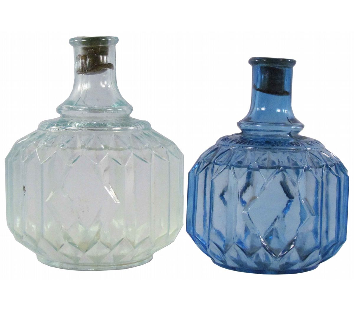 Hayward's Fire Hand Grenade. Embossed around shoulder. Sapphire and clear in 1 and 1 1/2 pint sizes. Both are full with original seals, no chips or cracks. 6 1/2 and 7 inches.