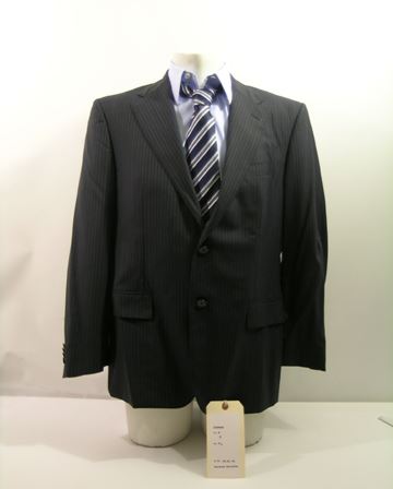 Coblenz (Michael Douglas) screen worn, hero, deep blue with thin white pinstripes two button 'Coneliani' suit jacket, (size 52R) pale blue long sleeve button front 'Anto' dress shirt, (custom size) and navy silk with white and royal stripes 'Zegna' neck tie. Includes wardrobe tag!