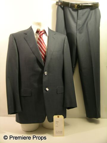 Coblenz (Michael Douglas) screen worn, hero, dark slate blue wool, two piece 'Canali' suit, (size 52R) black leather dress belt, white cotton long sleeve button front 'Anto' dress shirt, (custom) and scarlet with white diagonal stripes 'Bloomingdale's tie. Includes wardrobe tag!