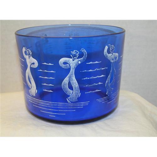 This Hazel Atlas cobalt blue ice bucket is listed in fair to good condition. The glass itself is in very good condition with no chips or cracks. There is some fair wearing to the dancing sailors on the sides.