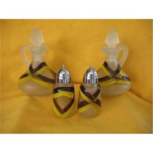 This wonderful hand painted cruet set with matching salt and pepper shakers are marked on the bottom: H with the A inside the bottom for the Hazel Atlas Company with the numbers 2-8 while the cruets just have the #12 on the bottom. <BR>The Hazel-Atlas Glass Company was a large producer of machine-molded glass containers headquartered in Wheeling, West Virginia. It was founded in 1902 in Washington, Pennsylvania as the merger of four companies:Hazel Glass and Metals Company, Atlas Glass Company, Wheeling Metal Plant and Republic Glass Company. By the 1930?s, Hazel-Atlas had fifteen plants and was the largest glass manufacturer in the world. It continued to make containers and tableware until the 1950s. In 1956, Hazel-Atlas, at that time the third largest producer of glass containers in the U.S., was acquired by the Continental Can Company. <BR>In frosted glass and handpainted with yellow and brown bands they are in very good condition, one of the frosted stoppers has an underside chip and the salt a cap is pealing, which I have shown in my pictures. The cruets measure 5 1/2 inches tall and 3 5/8 inches wide while the salt and pepper shaker measure 3 3/4 inches tall and 1 5/8 inches wide. If you look closely these are the original frosted stoppers on the cruets and not clear replacements which you see on many sets today. A wonderful addition to any table or Hazel Atlas Collection. <BR>SH & Ins. will be quoted after orders placed. If you have any questions contact me and thank you ...
