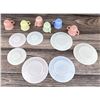 Plates are 5/8" tall, 5 7/8" in diameter, Cups are 2 7/8" tall, 2 1/8" in diameter, 2 1/2" long with handle.