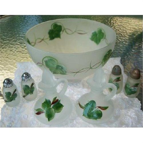 Vintage 1950's salad set by Hazel Atlas. All the pieces are satinized glass which is has a frosted appearance but is silky smooth to the touch. These were hand painted by either Gay Fad Studios or The Washington Co. decorators. Both companies decorated glassware from the large glass manufacturers of Anchor Hocking, Hazel Atlas and Federal during the 1950's. The set includes; the large 10 1/2" salad bowl, two pair of salt and pepper shakers, and two cruets. The two sets of shakers have different tops. One pair has chrome, while the other looks like brass. The chrome tops are starting to show some corrosion from age, and should be replaced. The two cruets have perfect glass top stoppers, Usually these have small chips from use. . There are no chips, cracks, or wear to the hand painted Ivy on any of the pieces. very nice complete set.