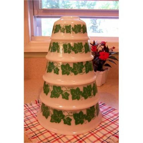 Pleased to offer this complete set of Hazel Atlas "Ivy" nesting bowls. The bowls are bright white glass with green ivy leaves. The 5 bowl set includes: 9", 8", 7", 6", and 5" sizes. The bowls are in very good condition showing minimal signs of use on the insides. The ivy pattern shows no wear or discoloration. No chips, cracks or other problems. Real clean pretty set.