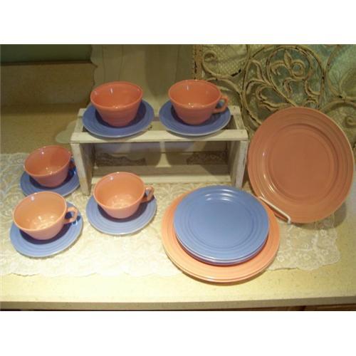 I have 17 pieces of Hazel Atlas Moderntone Platonite in pink and blue. Moderntone was produced from 1940 to the early 1950's and came in a rainbow of colors. This lot includes: (5) pink cups, (5) blue saucers, (4) blue 6 3/4" sherbet plates, and (3) pink 8 7/8" dinner plates. All of the dishes are chip and crack free. There is minimal wear to the fired on color. Nice glossy finish.