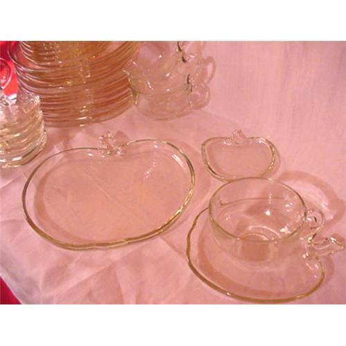Hazel Atlas apple shaped dishes in the Orchard pattern. 32 pieces includes 10 8" plates, 8 cups, 7 saucers and 7 ashtrays. All are in excellent condition.