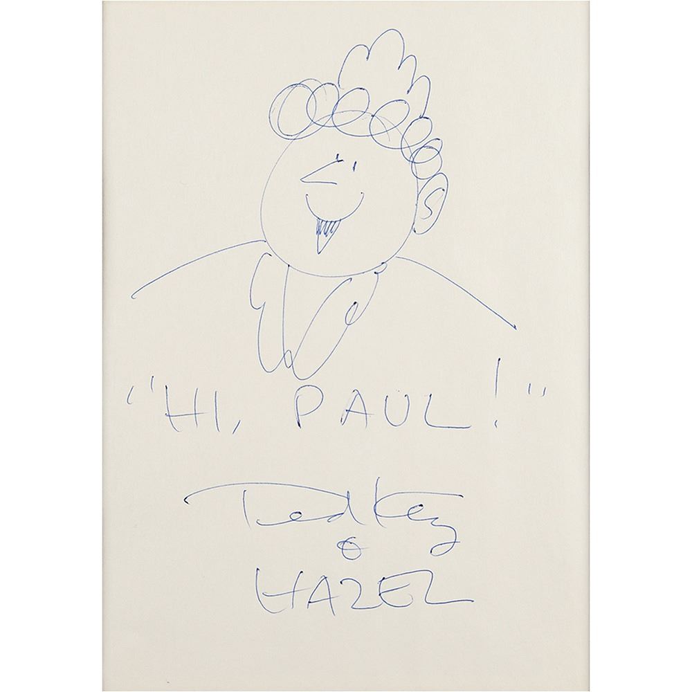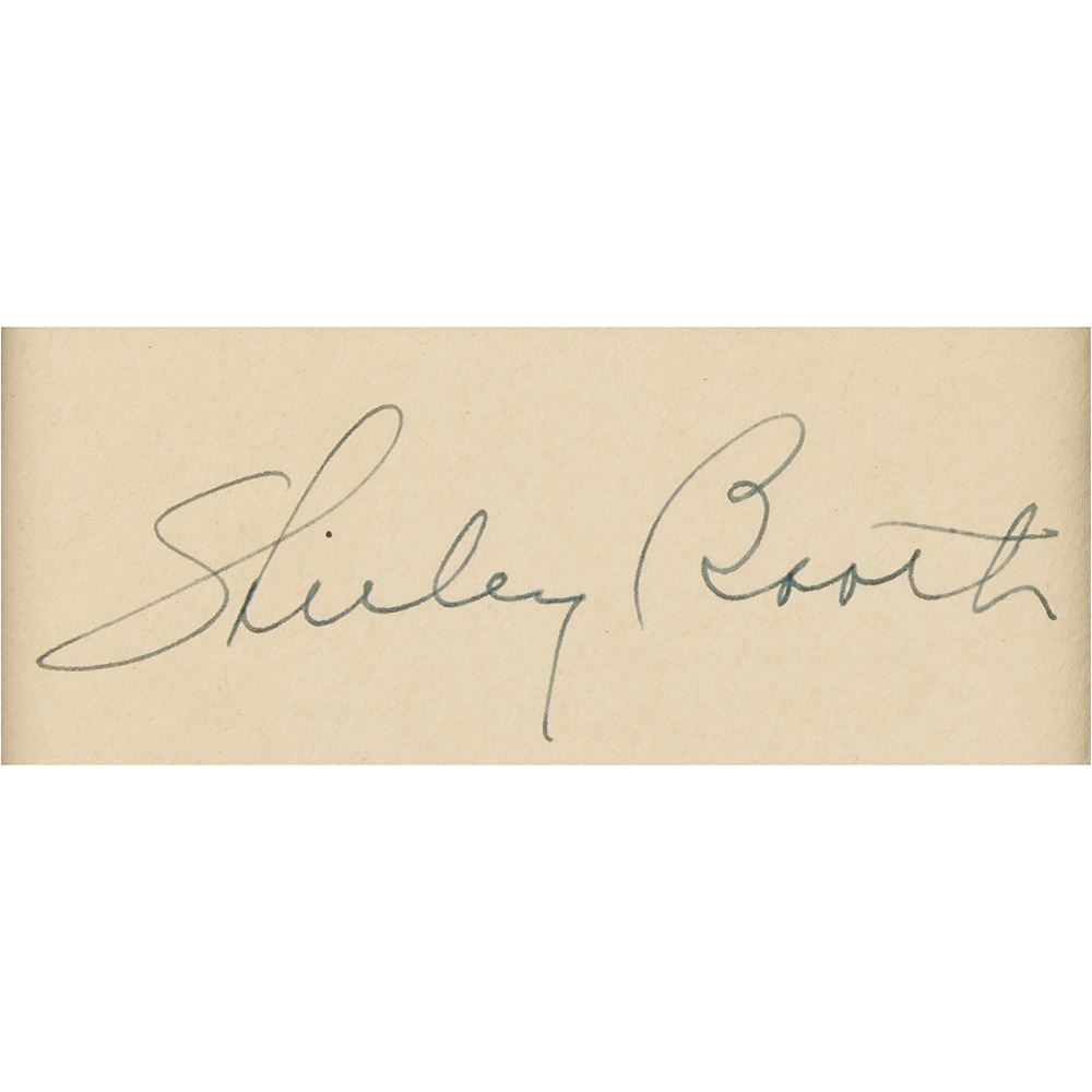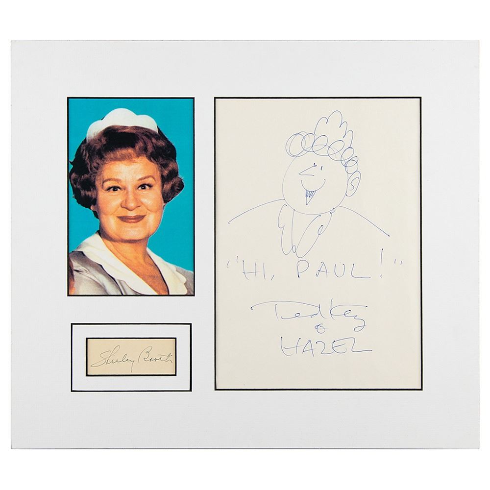 Two items: an original ballpoint sketch of Hazel by cartoonist Ted Key on an off-white 7 x 10 sheet, signed and inscribed below, "'Hi Paul!' Ted Key & Hazel"; and a vintage fountain pen signature of the Hazel actress, "Shirley Booth," on an off-white 3 x 1.25 slip. Matted and framed together with a portrait of Booth as Hazel to an overall size of 16 x 14. In overall fine condition.