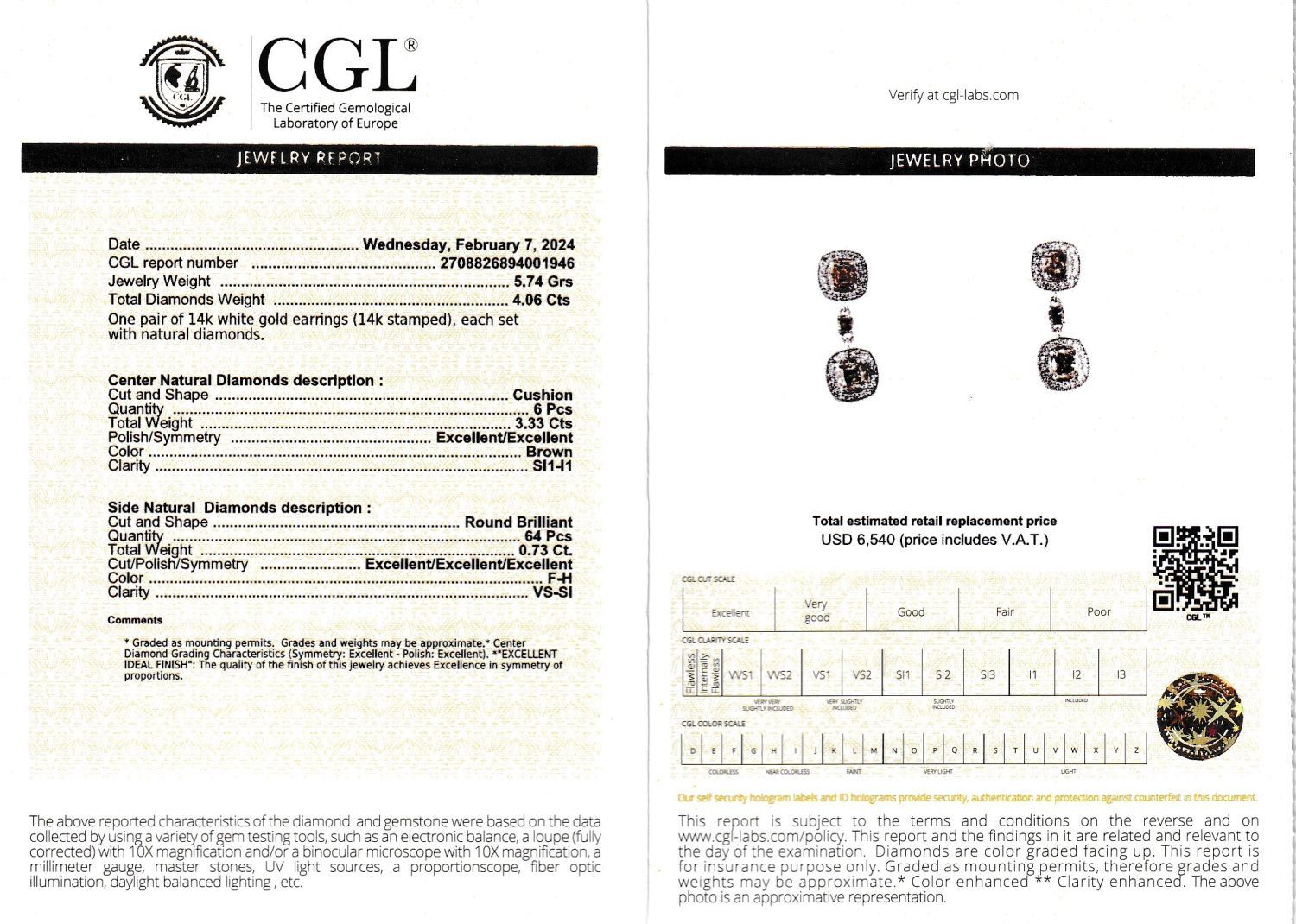 APPRAISAL DETAILS: These earrings are certified and appraised for $6,540.00 estimated retail replacement value by Certified Gemological Laboratory of Europe (CGL).