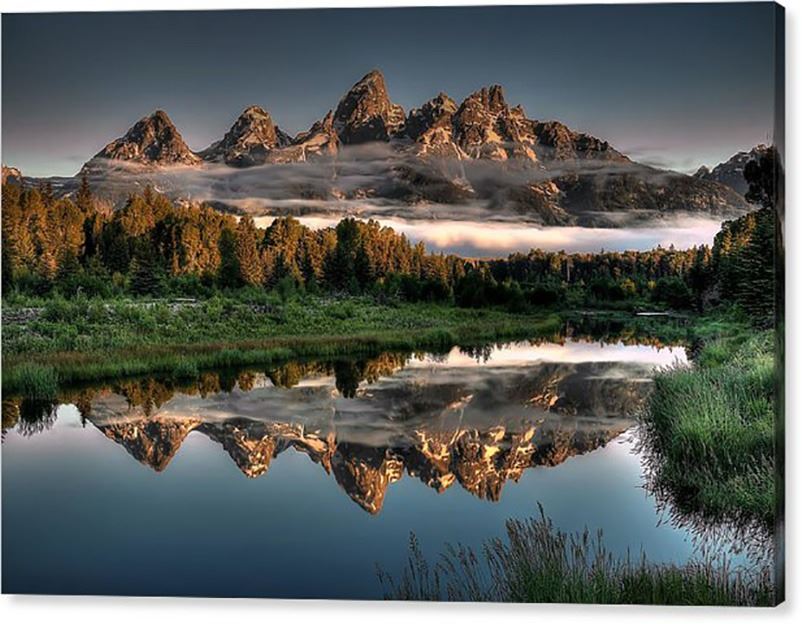 Hazy Reflections At Scwabacher Landing Print on Canvas by Ryan Smith. Dimensions are 30 inches by 20 inches. Your canvas print comes gallery wrapped and will be delivered to you ready to hang with pre-attached hanging wire, mounting hooks, and nails.