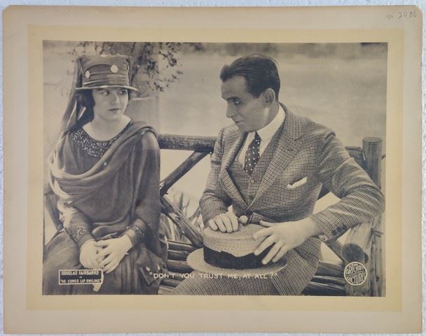 He Comes Up Smiling (Douglas Fairbanks Pictures, Distributed by Artcraft Pictures Corporation, 1918) lobby card. Comedy, Adventure, Romance. Starring Douglas Fairbanks, Marjorie Daw, Herbert Standing, Frank Campeau, Bull Montana, Albert MacQuarrie, Kathleen Kirkham, William Elmer. Directed by Allan Dwan. Some edge wear, light tear, light paper loss, tape. Fine. (11"x14").
