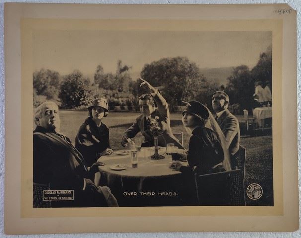 He Comes Up Smiling (Douglas Fairbanks Pictures, Distributed by Artcraft Pictures Corporation, 1918) lobby card. Comedy, Adventure, Romance. Starring Douglas Fairbanks, Marjorie Daw, Herbert Standing, Frank Campeau, Bull Montana, Albert MacQuarrie, Kathleen Kirkham, William Elmer. Directed by Allan Dwan. Edge wear, light creases, tear, tape. Fine. (11"x14").