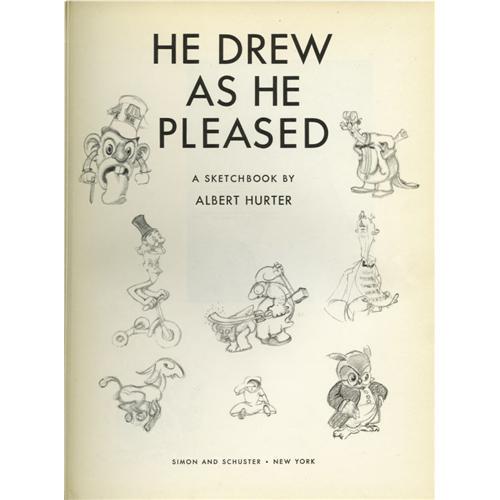 <B>He Drew As He Pleased: A Sketchbook by Albert Hurter (Simon and Schuster, 1948)</B></I>. A delightful book with 700 drawings by Disney artist Albert Hurter, who helped conceptualize the Three Little Pigs, Snow White, Bambi, Fantasia, Pinocchio, and many more. Hardcover, 9" x 12". This appears to be a first edition, as nothing on the copyright page indicates otherwise. There is a "library loaned" stamp (from the Western Publishing library) on the frontpapers. Book is in Very Good condition, dust jacket is Poor with large pieces missing. <I>From the Random House Archives.</B></I>