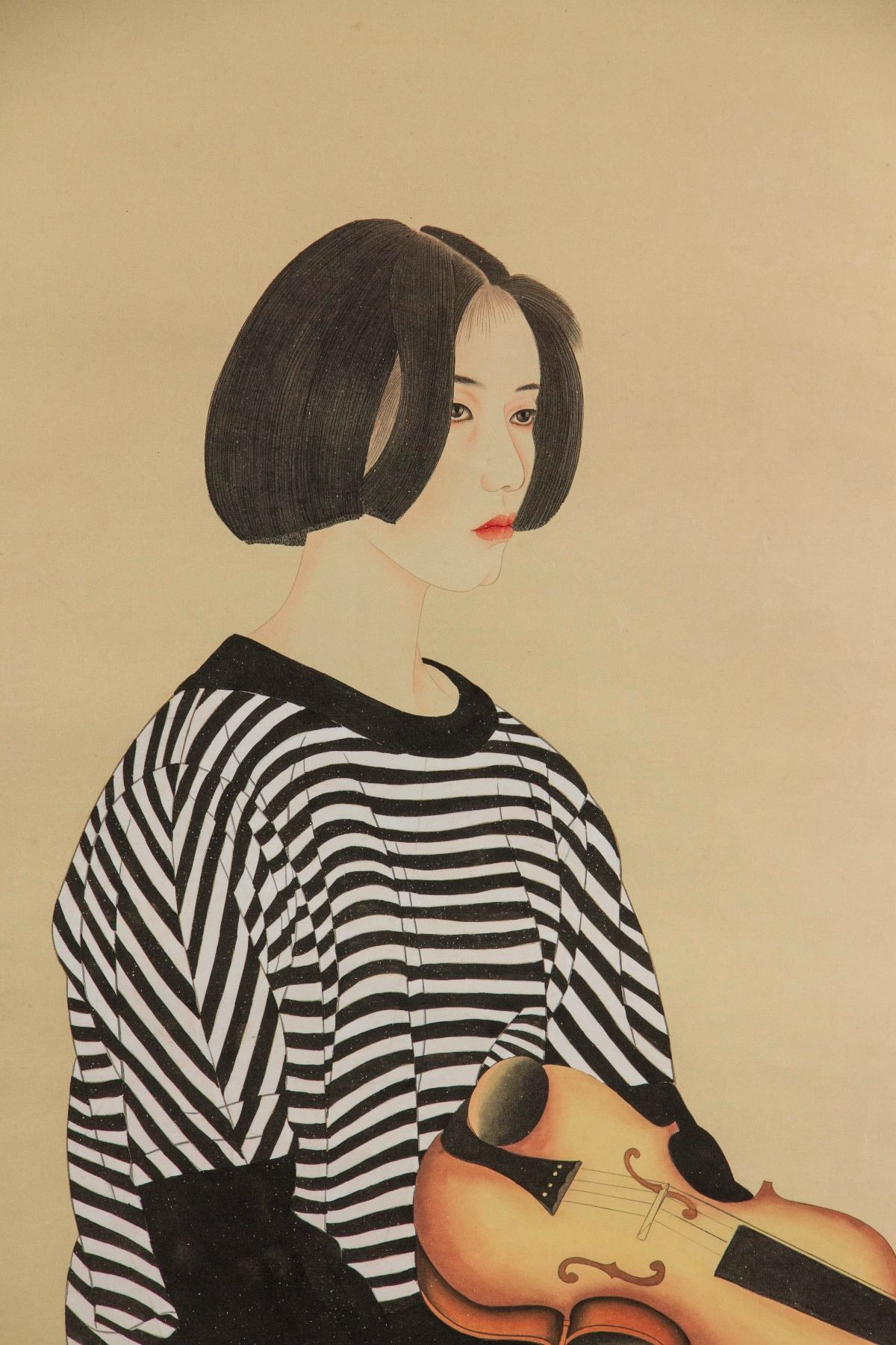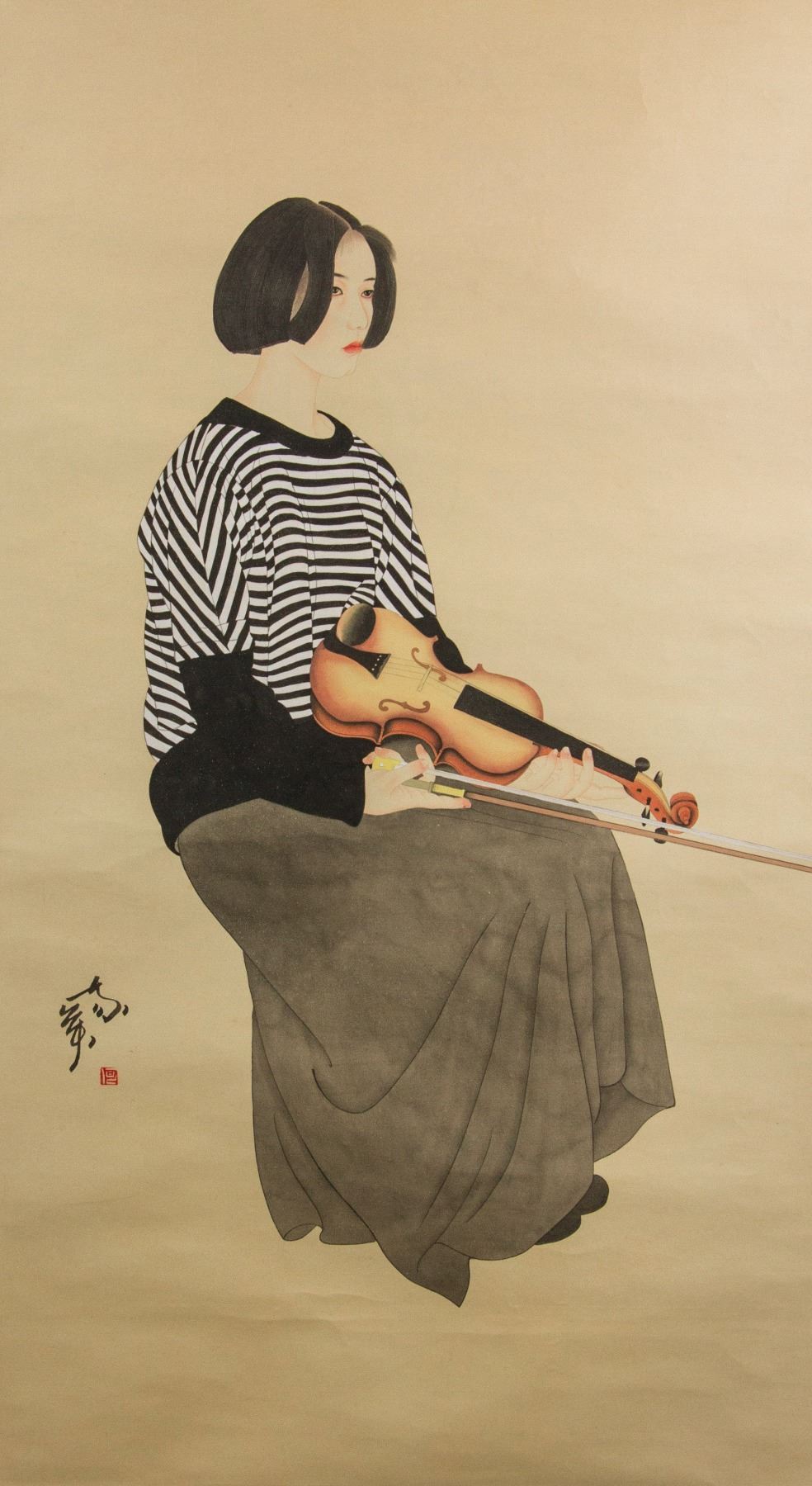 Painting of a sitting woman with violin; Chinese ink and watercolour on paper roll; signed He Jiaying (b.1957); inscribed with 1 artist seal; 112 cm x 62.5 cm