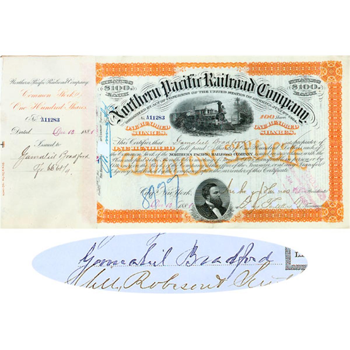1880, Northern Pacific Railway Stock certificate for 100 shares issued to and signed by GAMALIEL BRADFORD (1863–1932) American biographer. Achieved literary fame as a biographer with his Lee, the American (1912). He perfected the method of writing “psychographs,” or short portraits of historical figures. A novel approach that identified subjects' essential characteristics from a succession of significant moments in their lives. His works in this area include Confederate Portraits (1914), Union Portraits (1916), and Damaged Souls (1923). Signed on verso Power of Attorney certificate attached: “Gamaliel Bradford”. Attractive certificate with ornate border, vignette of a train passing by telegraph lines in the countryside and a lower vignette of Fredrick Billings. Orange/Black. Punch hole cancellations not affecting signature. Very Fine.