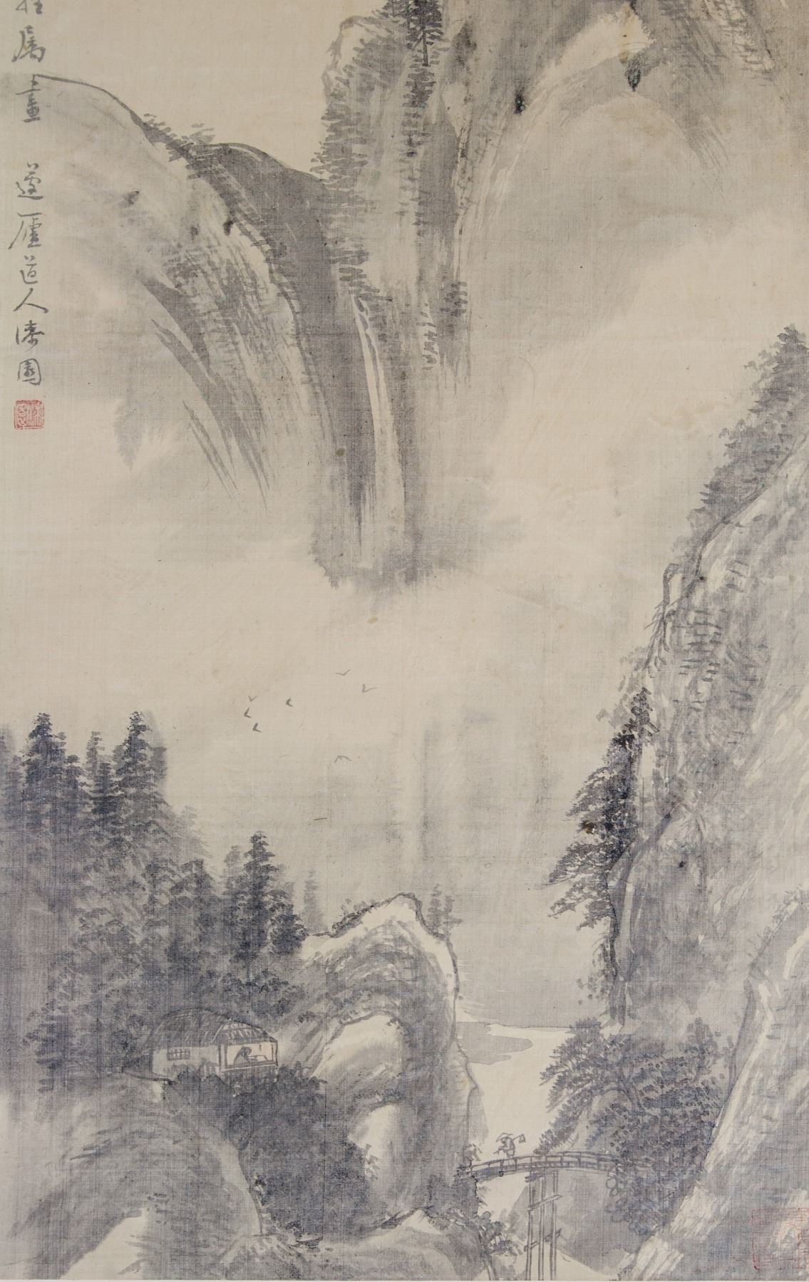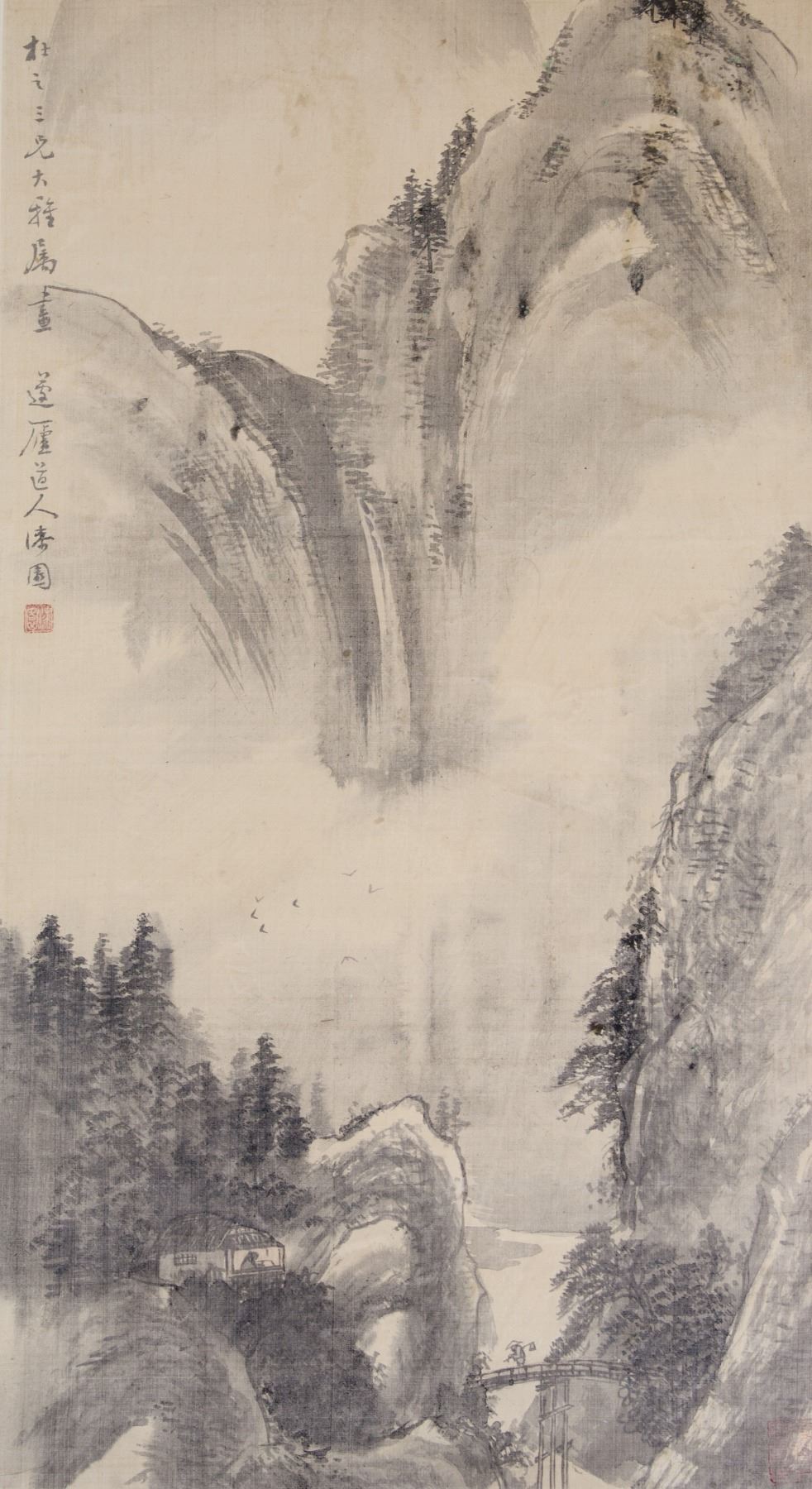 Ink on silk roll. Featuring mountainous landscape and village. Signed He Qingyuan, Sui Lu Dao Ren, inscribed with 2 artist seals. 71 x 41 cm