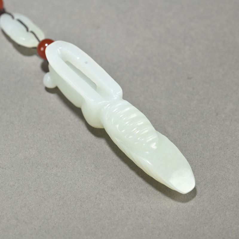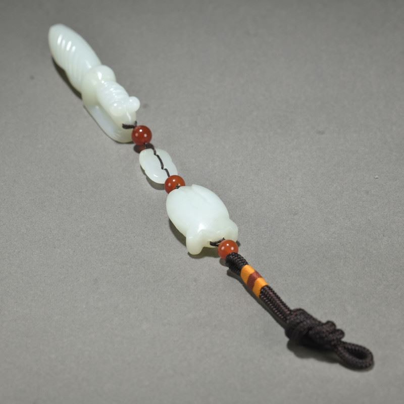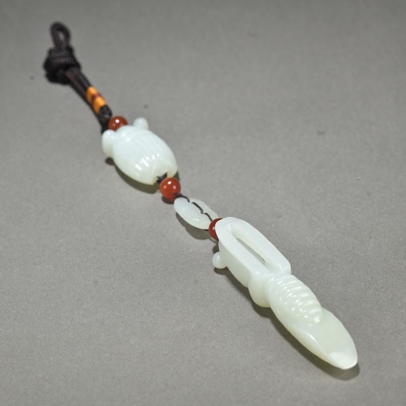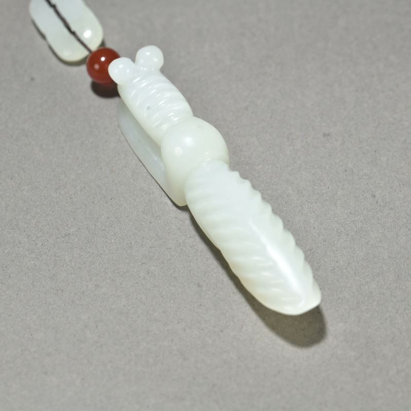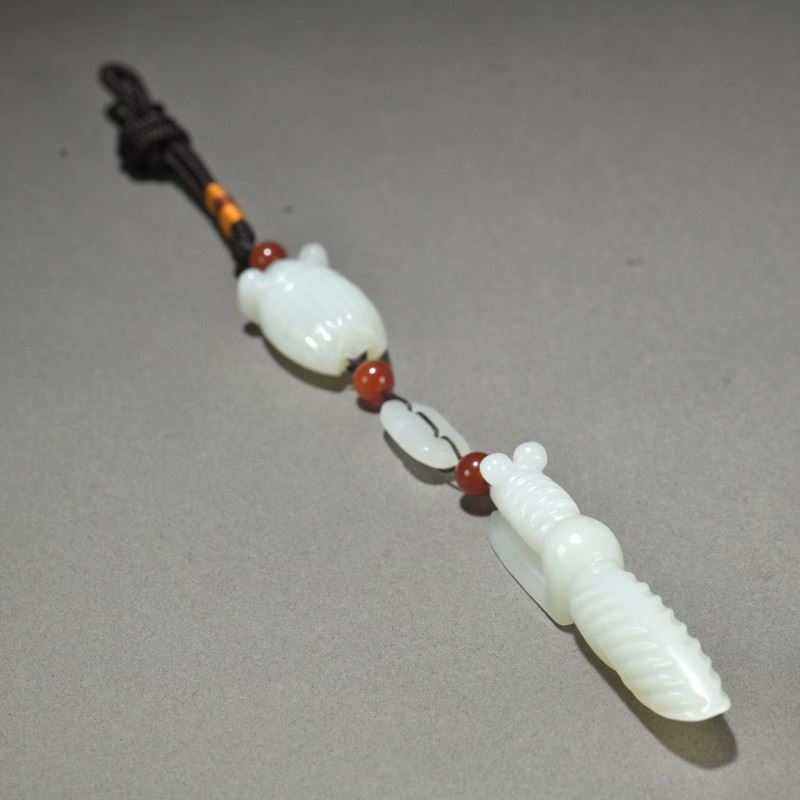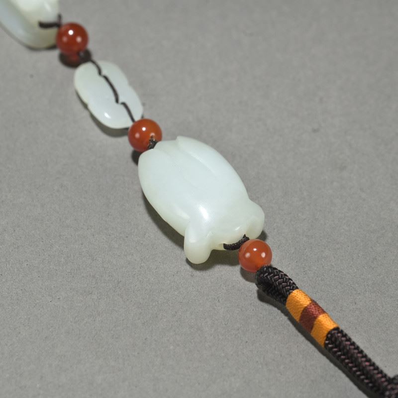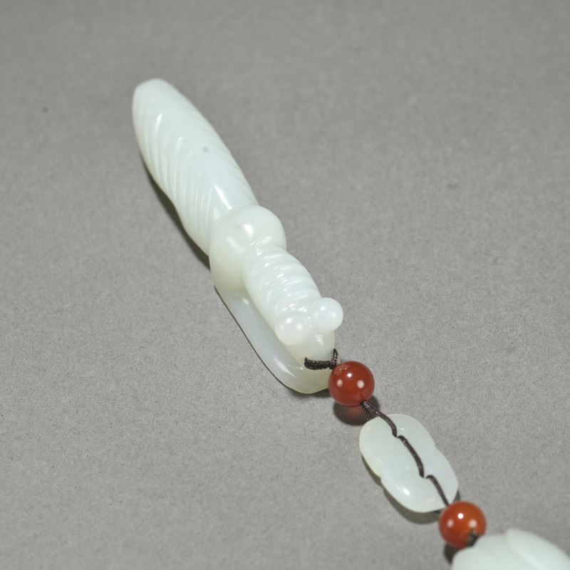 This He Tian jade pendant is delicately carved, showcasing the natural beauty of the mantis and cicada. The mantis grasps the cicada, symbolizing capture and the cycle of life. The red agate beads interspersed between the jade pieces add a vibrant touch, highlighting the fine jade carving technique and unique artistic expression.