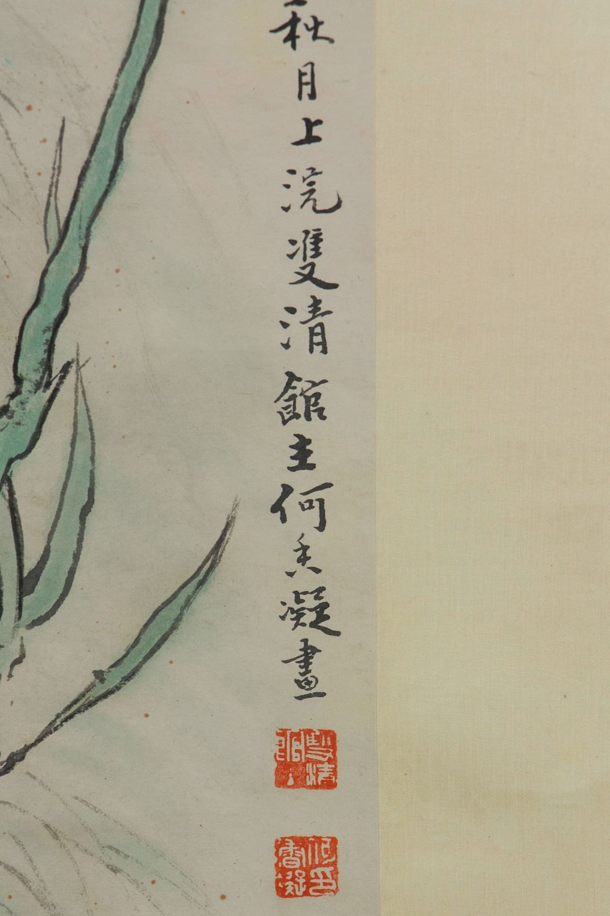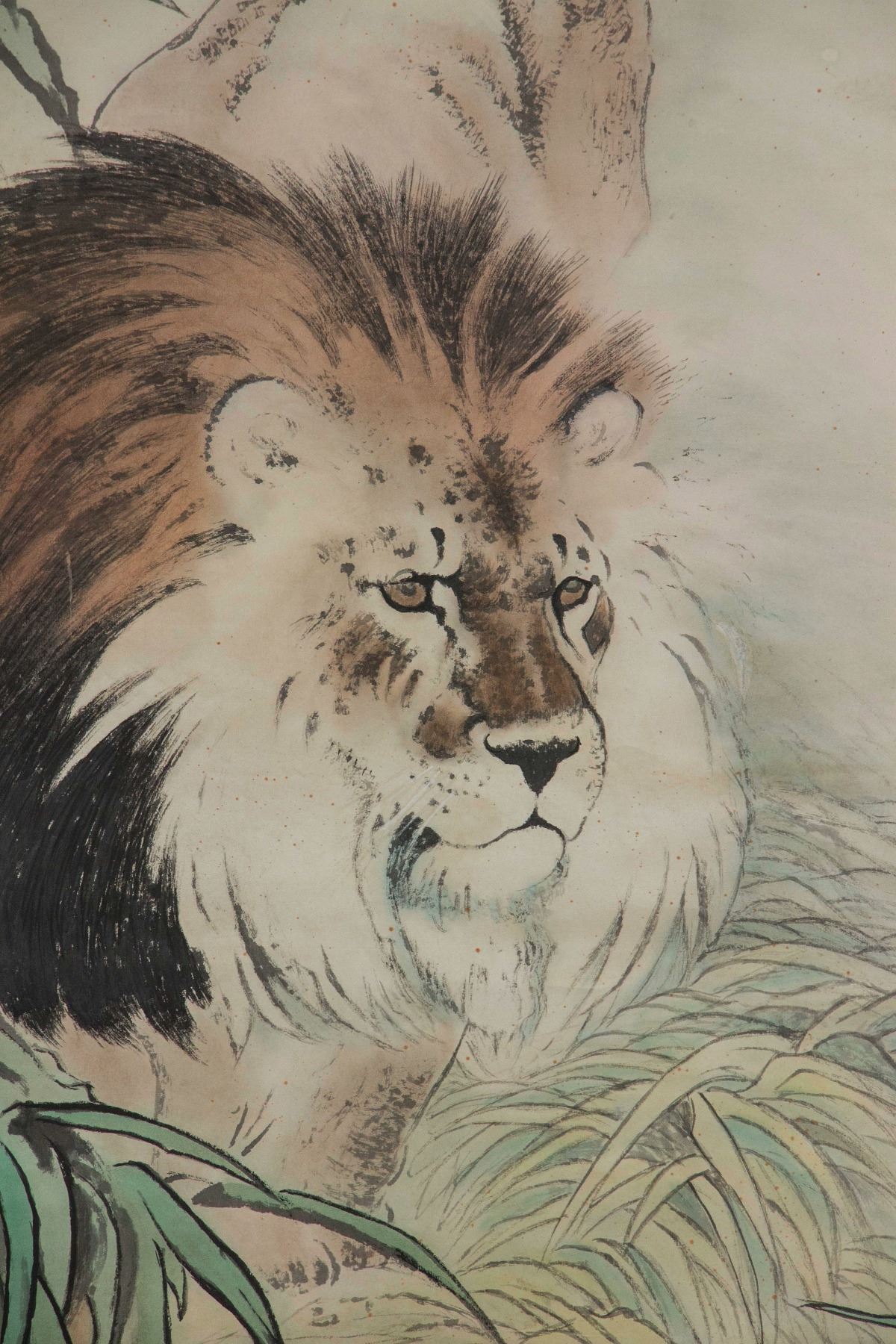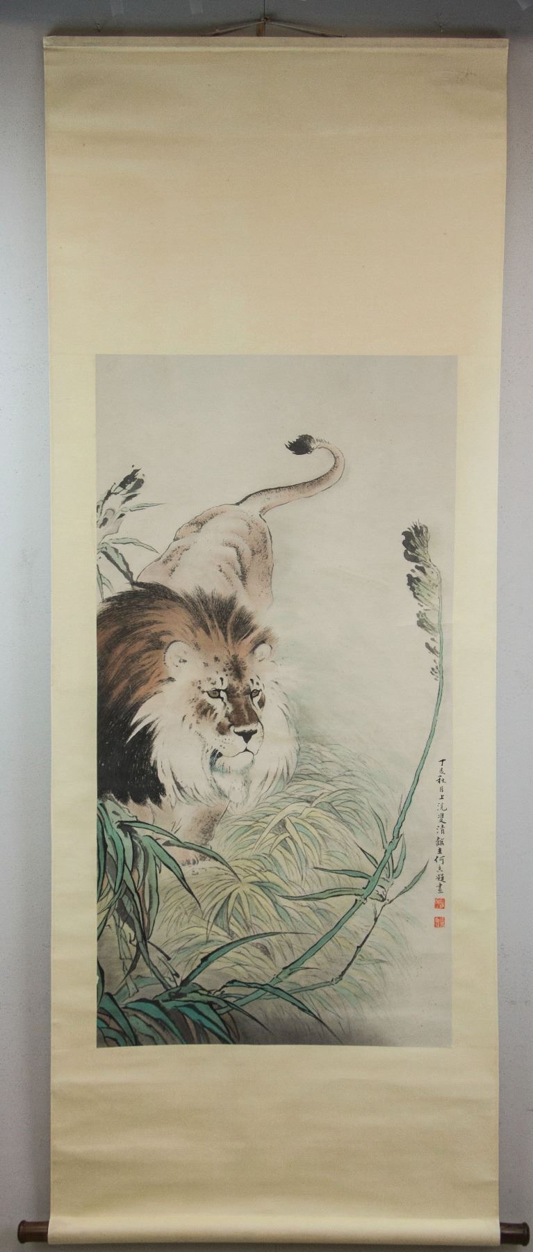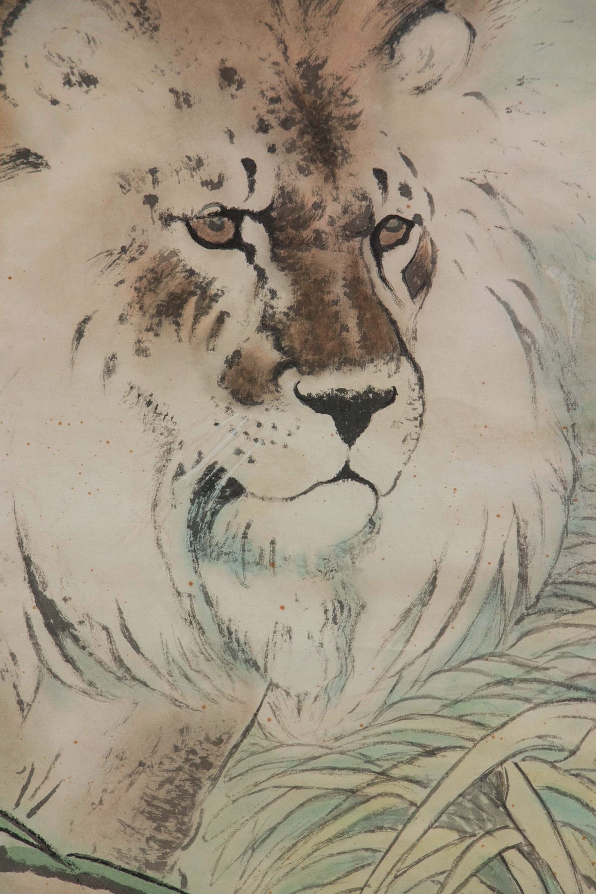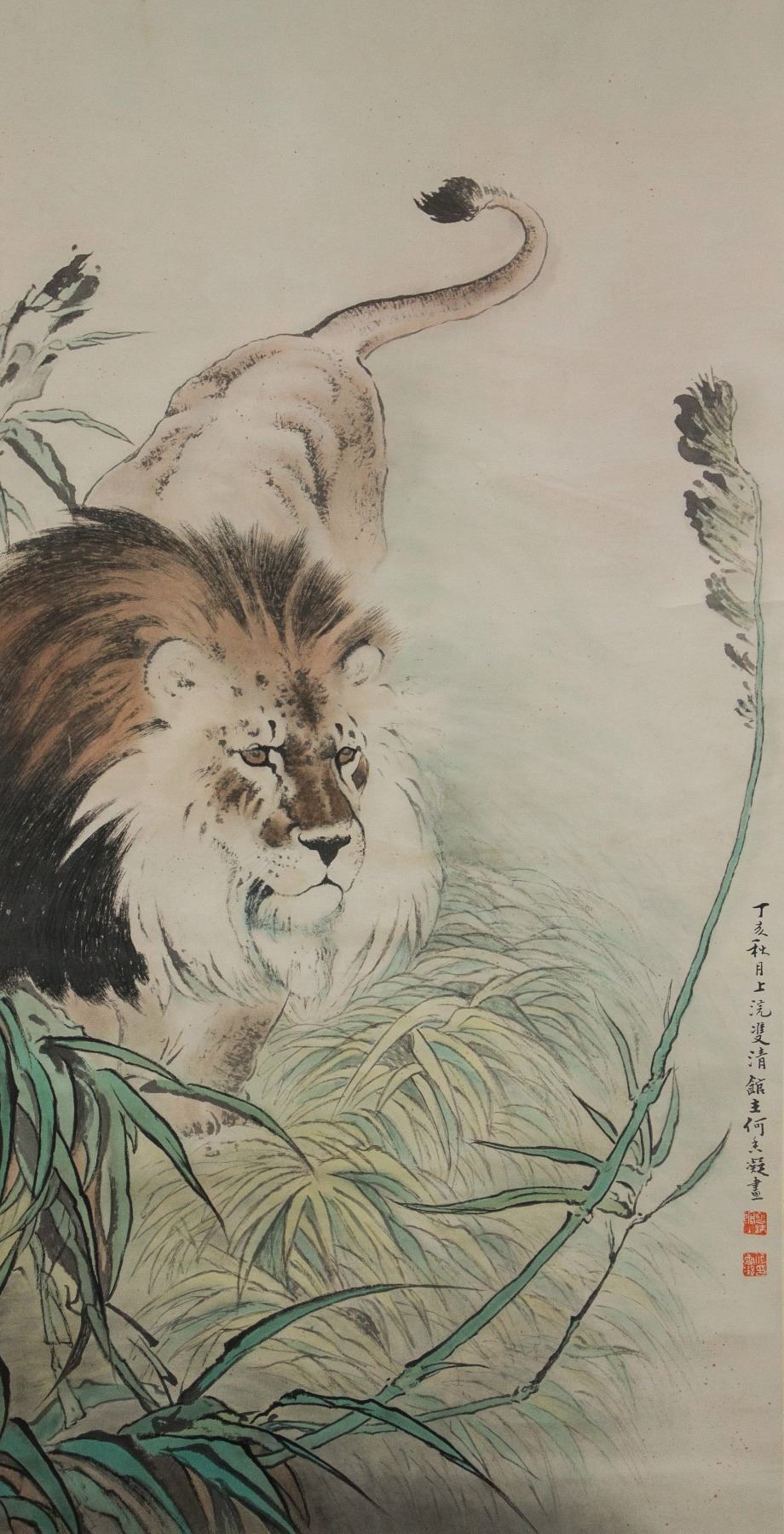 Painting of male lion; Chinese ink and watercolour on paper; hanging scroll; signed He Xiangning (1878-1972); inscribed with 2 artist seals; 110 cm x 57 cm