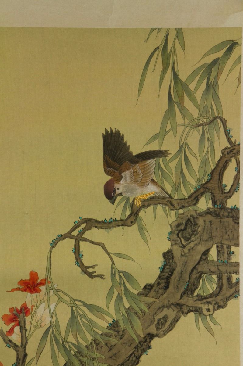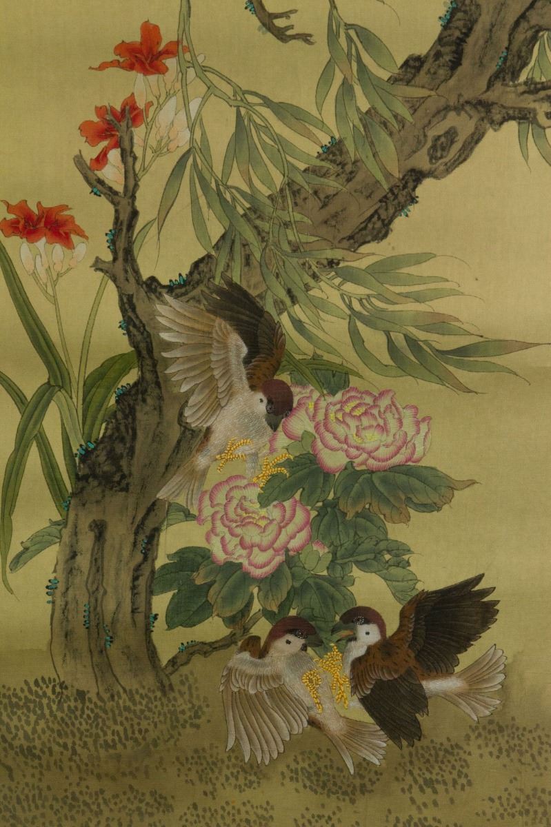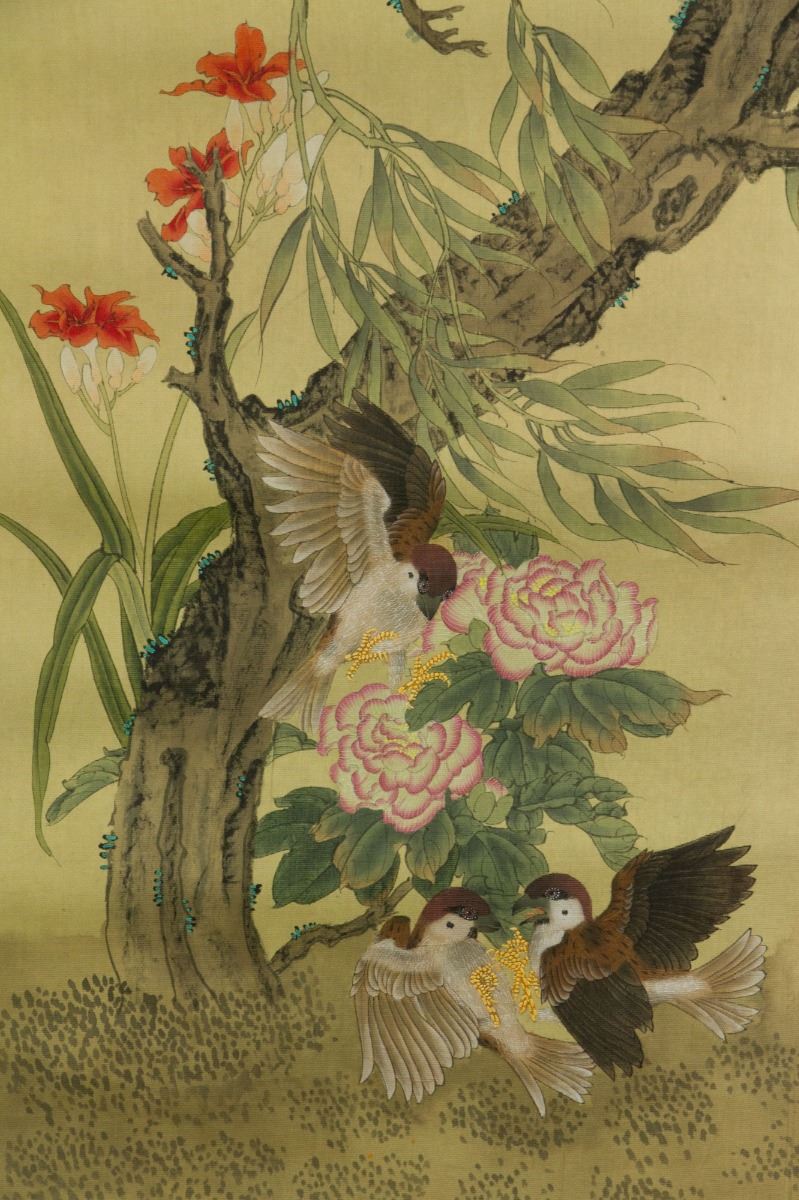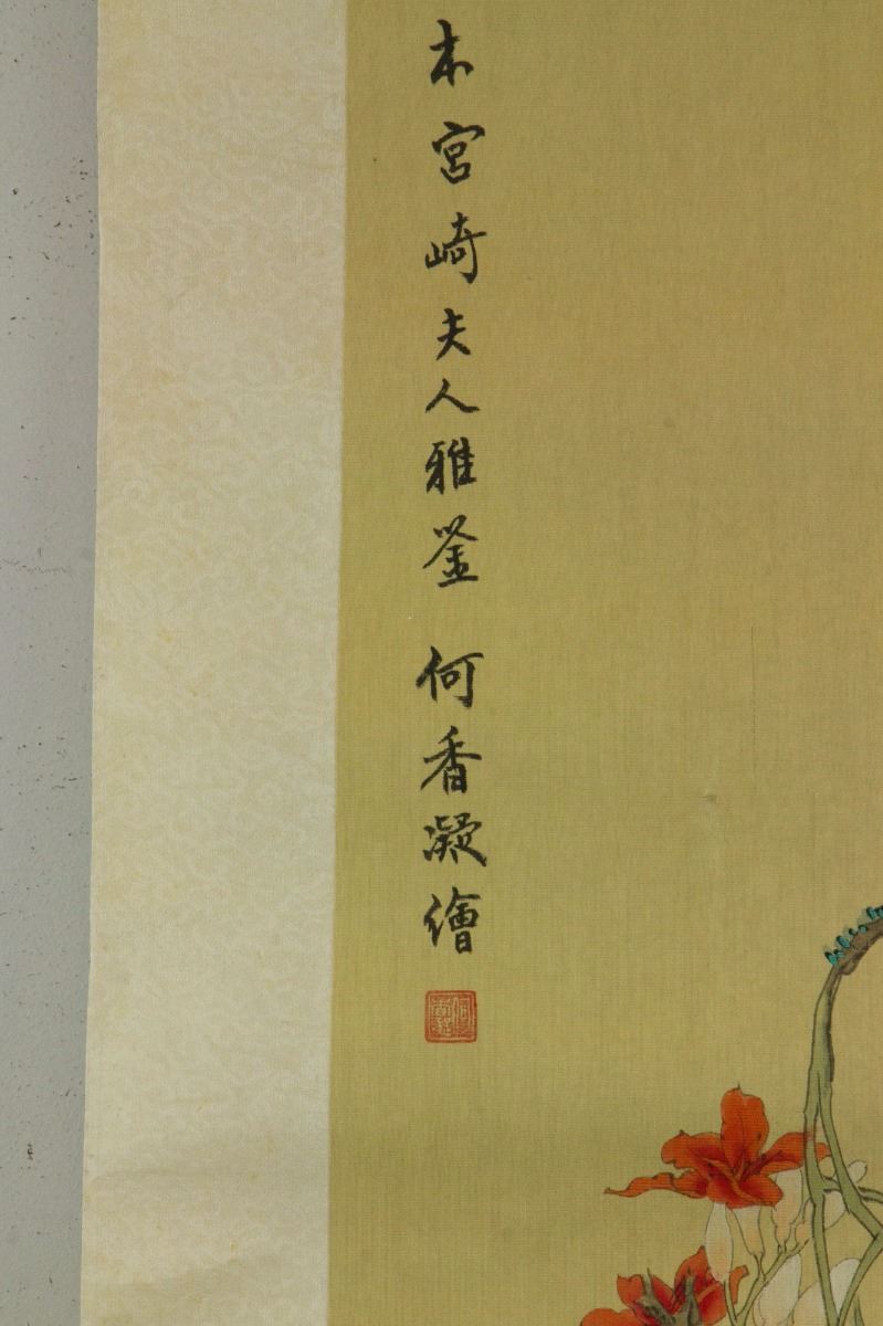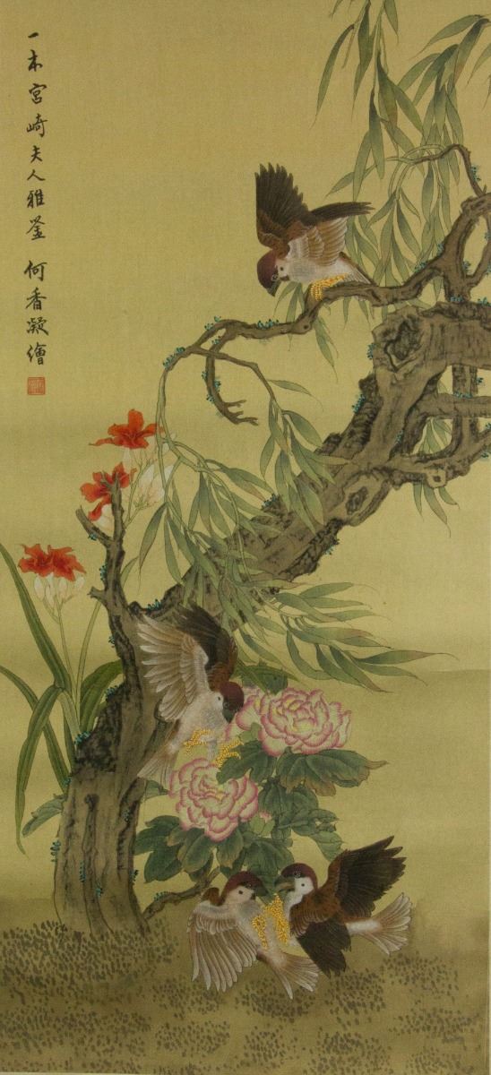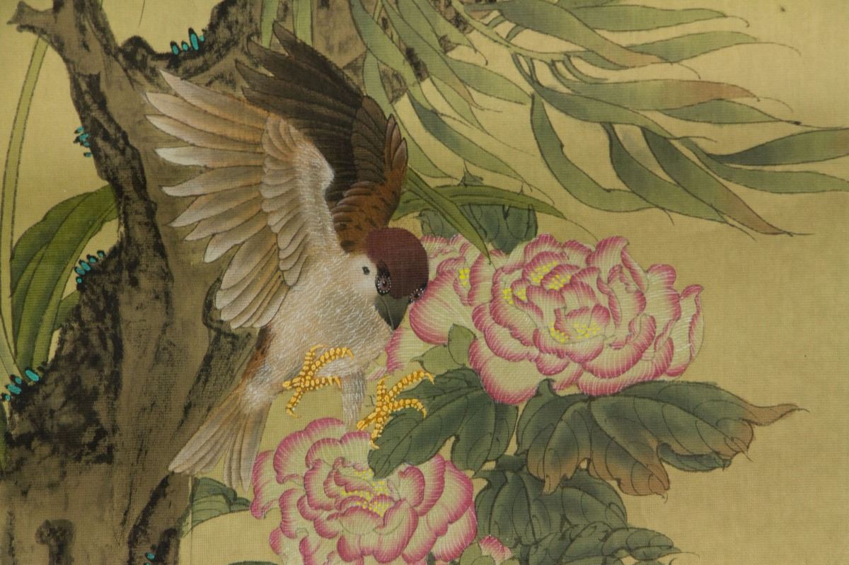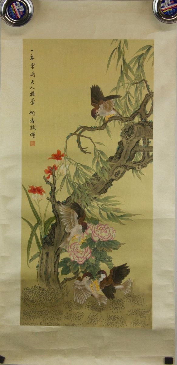 Four Chinese hwamei birds and peony flowers; Chinese ink and watercolour on silk roll; signed He Xiangning (1878-1972); inscribed with 1 artist seal; 89 cm × 41 cm