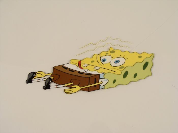This original animation cel is from the Nickelodeon TV show SpongeBob Squarepants. The story takes place under the deep blue sea in Bikini Bottom, where SpongeBob resides. SpongeBob, who is a yellow, porous sponge, is your typical happy-go-lucky character, as he is always cheerful and enjoys making people laugh. Patrick Star, SpongeBob's neighbor who is a starfish, is your average children's show idiot, as he boasts knowing nothing and is often getting himself into ridiculous situations. Between the homes of these two lies the home of the miserable Squidward, a squid, who is known for being grouchy and playing tricks on SpongeBob and Patrick. Both SpongeBob and Squidward work at the Krusty Krab, a fast food business run by the greedy money-loving Mr. Krabs, a crab, the arch rival of the evil, possibly misunderstood, Plankton. Another neighbor, Sandy Cheeks, an athletic squirrel who normally wears an astronaut's space suit, was introduced in "Tea at the Treedome." She spends most of her time inventing and experimenting. There appears to be heat marks over SpongeBob.Original Production Animated Cel Overall Size of Cel: 10 1/2" x 12 1/2" Very Good ConditionThis is an original hand-painted cel set-up used in the production of an episode of "SpongeBob SquarePants." Each one-of-a-kind set-up represents a slight change in position of the characters. When individually photographed and projected in rapid succession, the images appear to move.